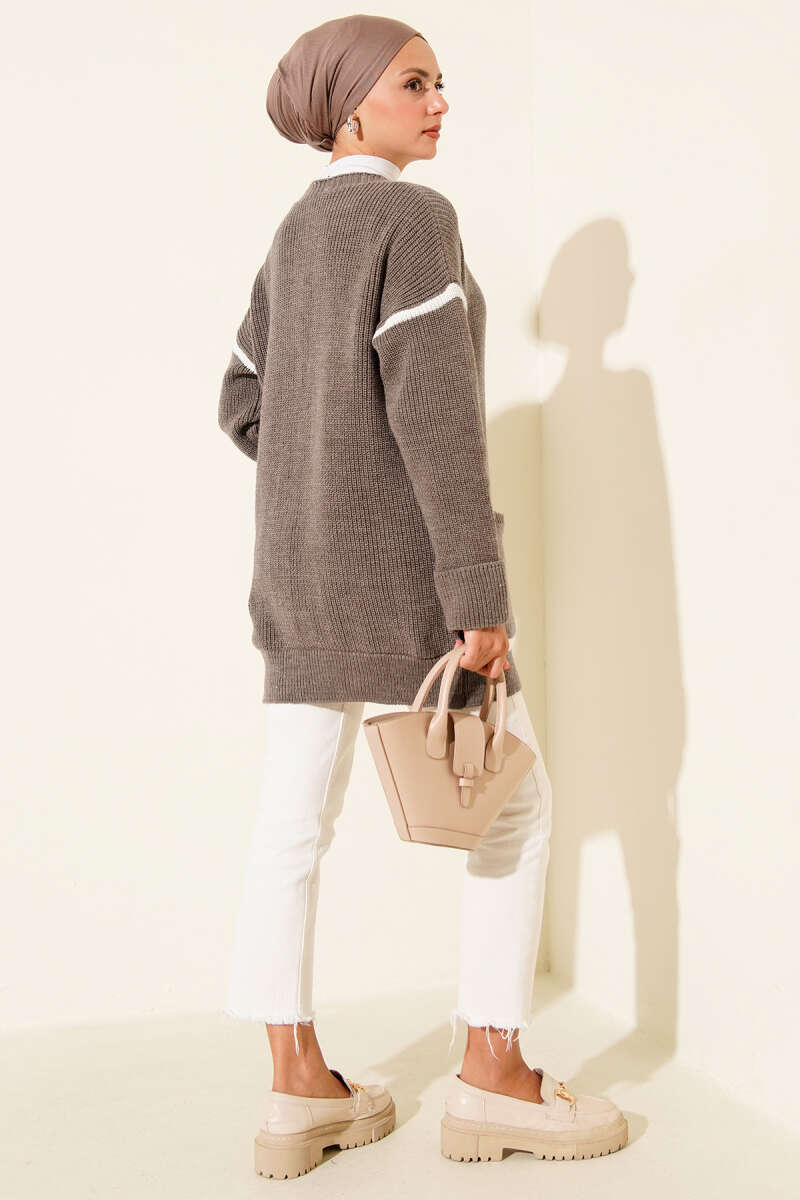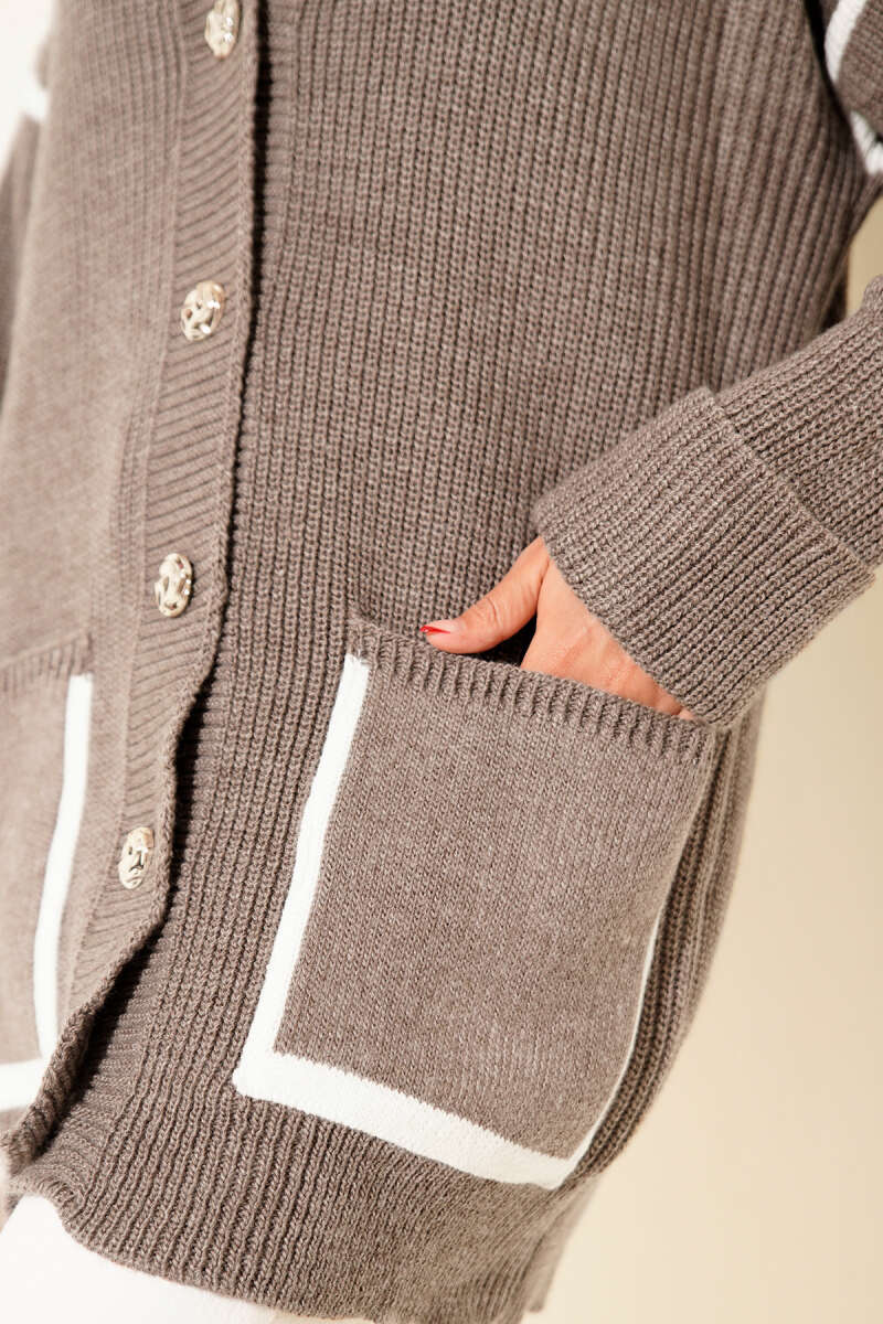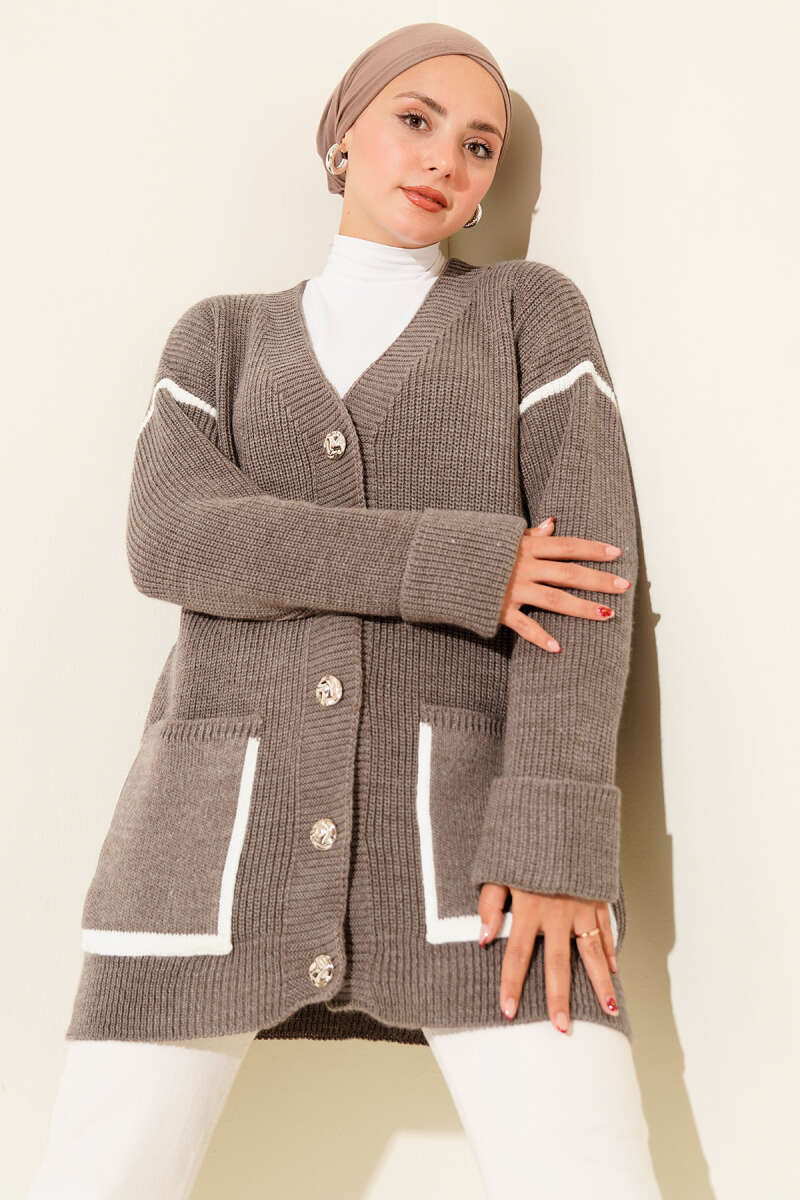 Baklava Desen Sakallı Düğmeli Triko Hırka Siyah Camel