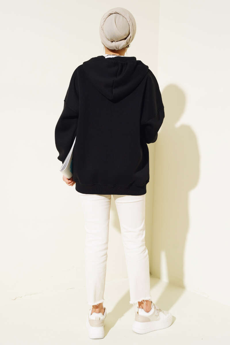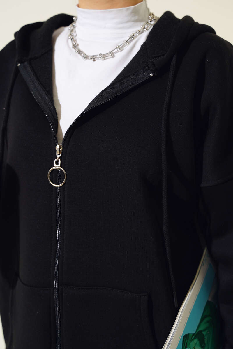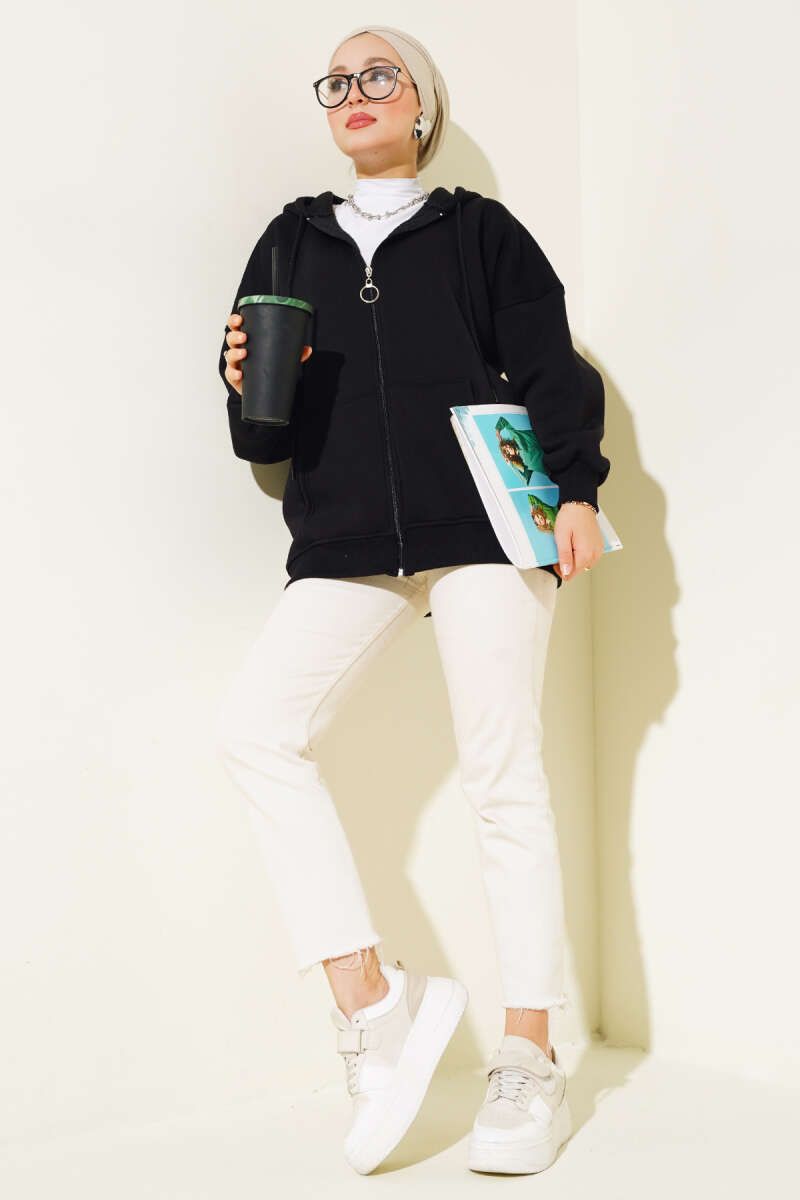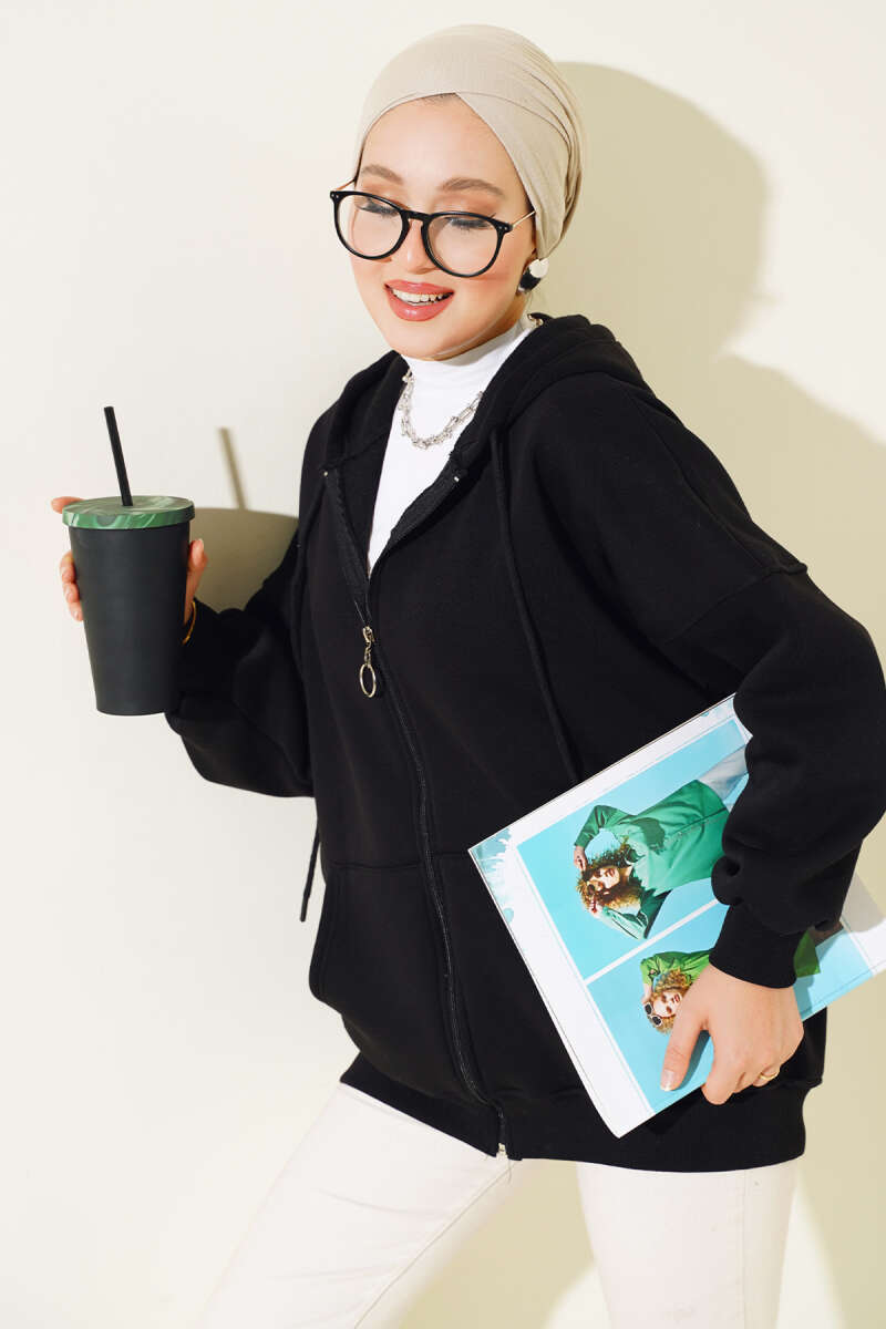 Cepli Kapüşonlu Üç İplik Hırka Siyah
