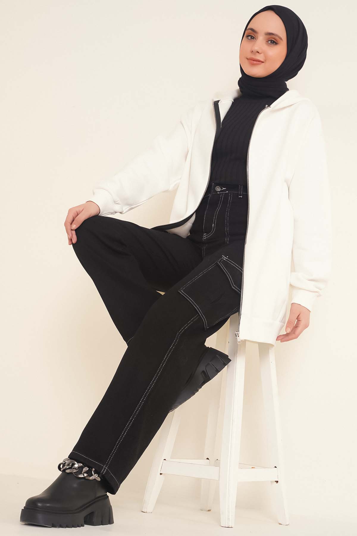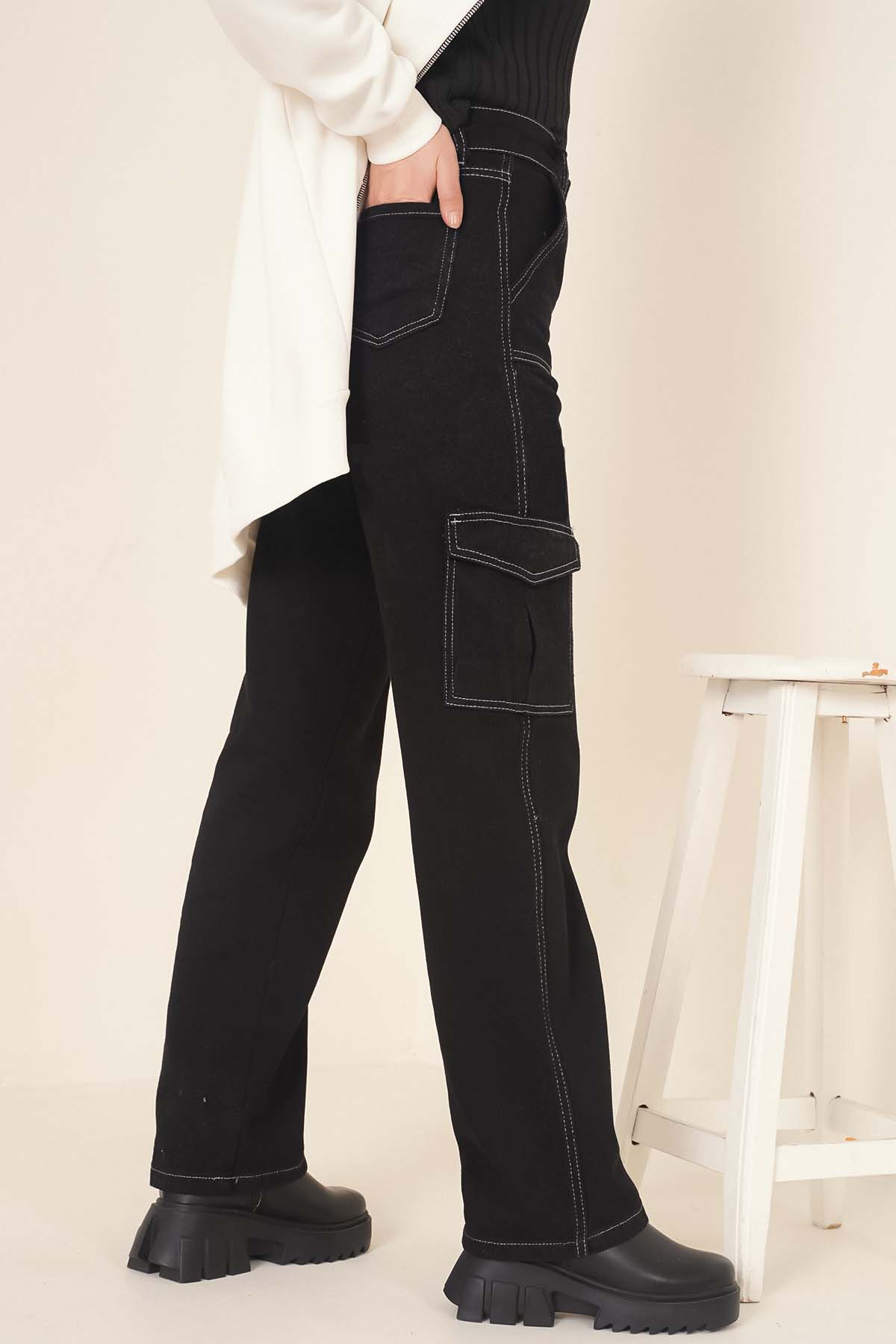 Yeni sezonda sportif çizgiler taşıyan şık kargo pantolonumuz sizlerle. İki adet arkada, iki adet önde, iki adet yanında olmak üzere toplam altı adet cebi vardır. Pantolonumuz düğmeli ve fermuarlıdır. Yüksek bel olan kargo pantolonumuz beş adet kemer köprüsüne sahiptir.