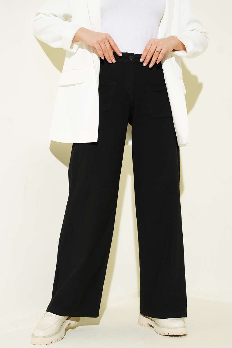Cepli Keten Geniş Paça Pantolon Lacivert