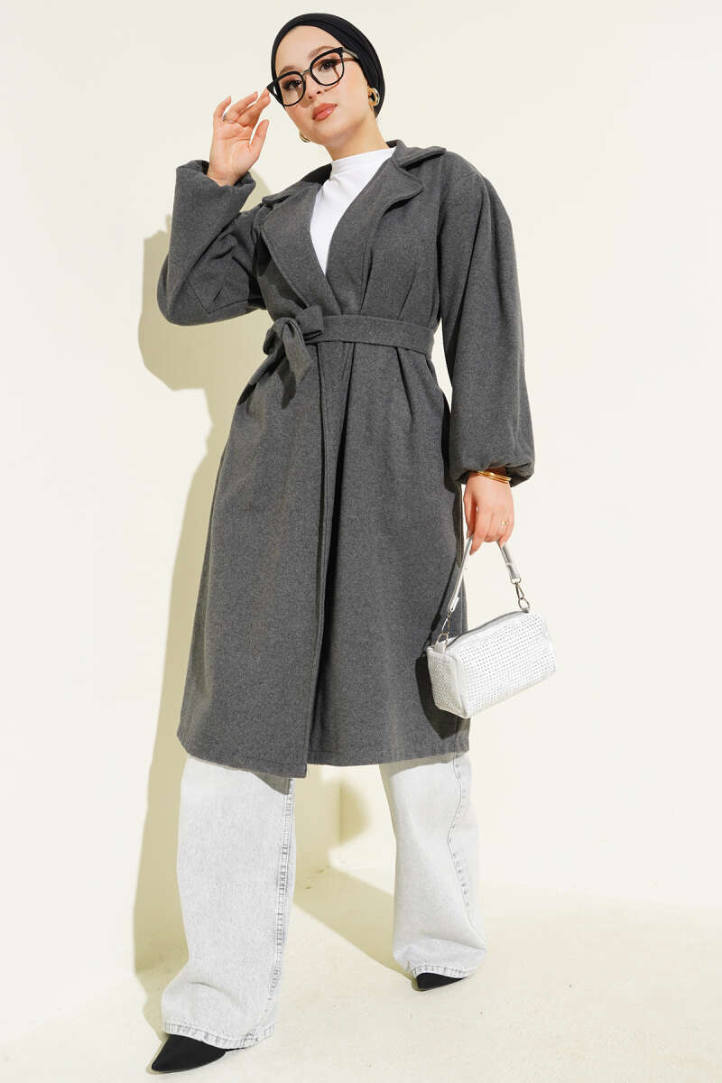 Cepli Kuşaklı Kruvaze Yaka Kaşe Kaban Gri