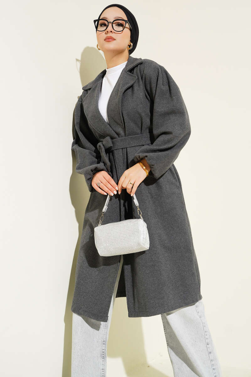 Cepli Kuşaklı Kruvaze Yaka Kaşe Kaban Füme