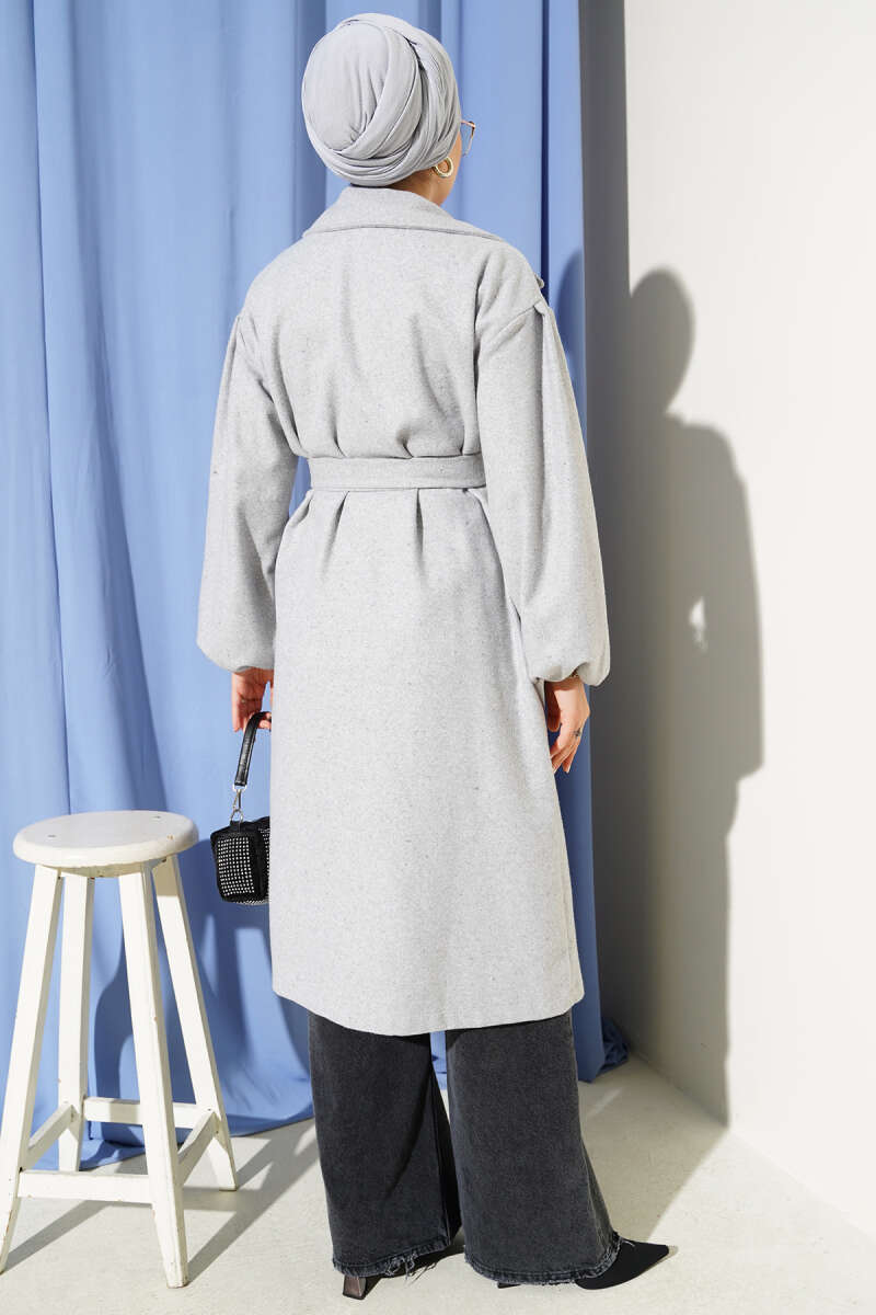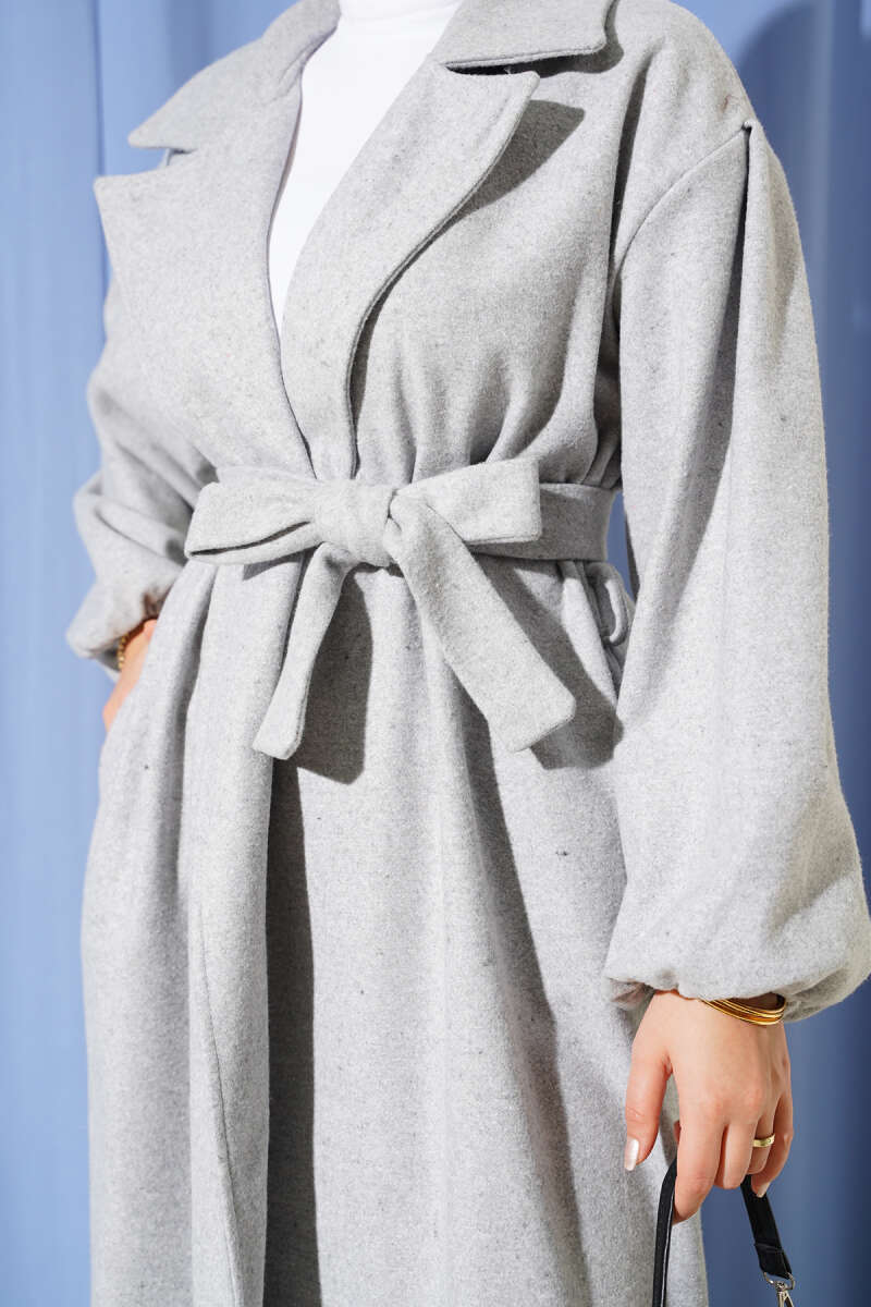 Cepli Kuşaklı Kruvaze Yaka Kaşe Kaban Gri