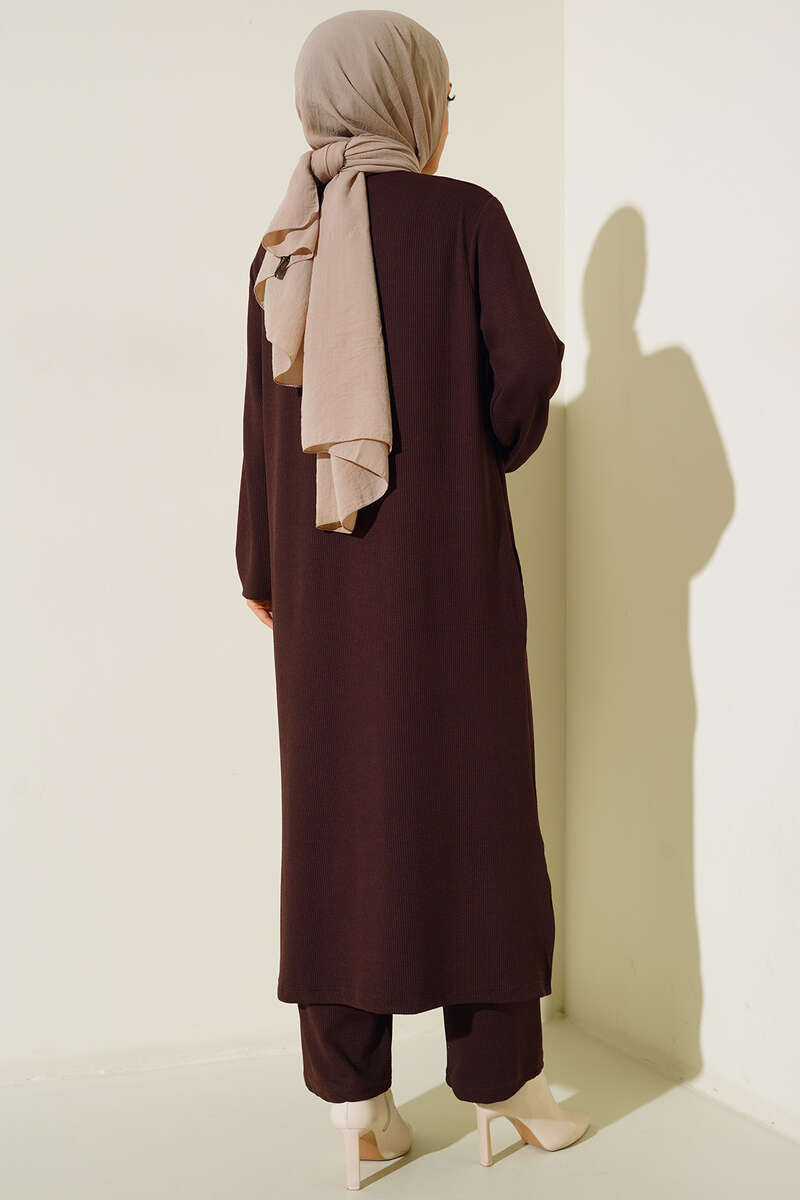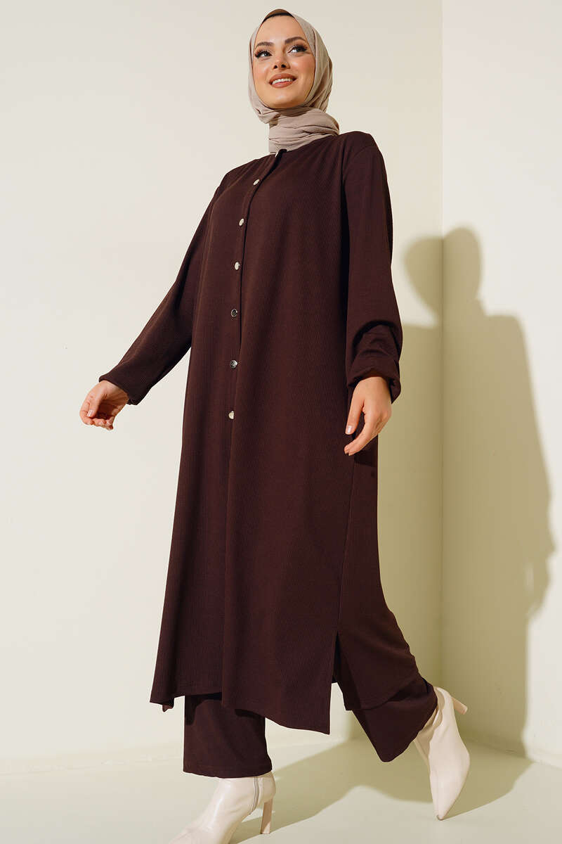 Rahatlığın adresi ikili takımlar...Esnek kumaş yapısına sahip ikili takımımız oldukça rahattır. Tuniğimiz boydan düğmeli model olup iki yan kısmında mini yırtmaç detayları bulunmaktadır. Tunik düşük omuzlu ve bilekleri lastiklidir. İki adet aktif kullanılan cebi bulunmaktadır. Pantolon beli lastikli ve esnektir cepsiz modeldir.