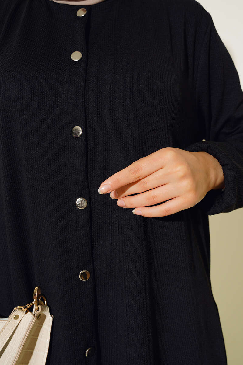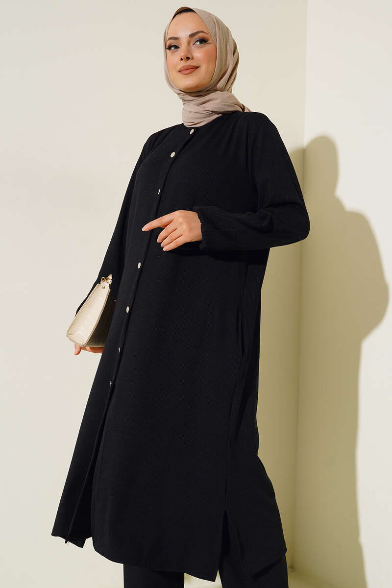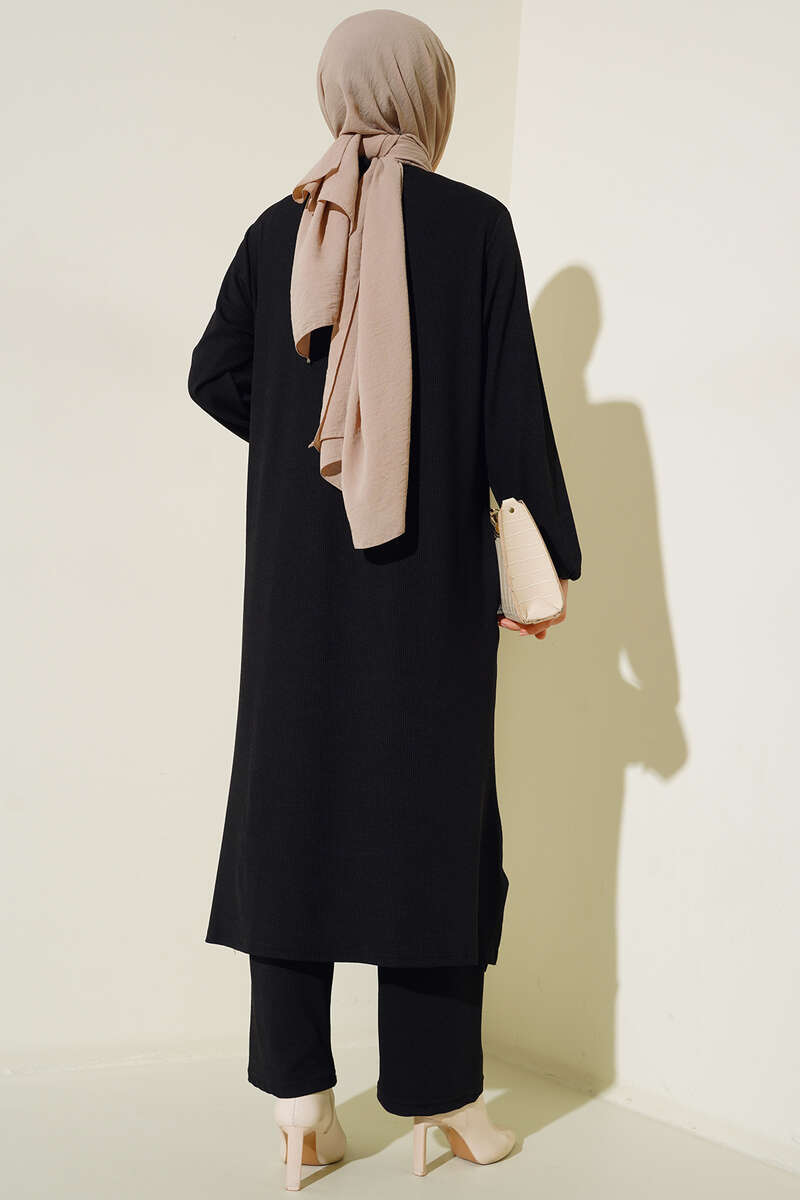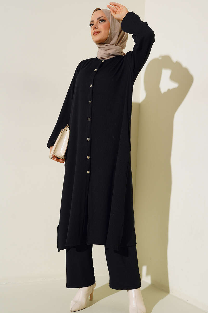 Rahatlığın adresi ikili takımlar...Esnek kumaş yapısına sahip ikili takımımız oldukça rahattır. Tuniğimiz boydan düğmeli model olup iki yan kısmında mini yırtmaç detayları bulunmaktadır. Tunik düşük omuzlu ve bilekleri lastiklidir. İki adet aktif kullanılan cebi bulunmaktadır. Pantolon beli lastikli ve esnektir cepsiz modeldir.