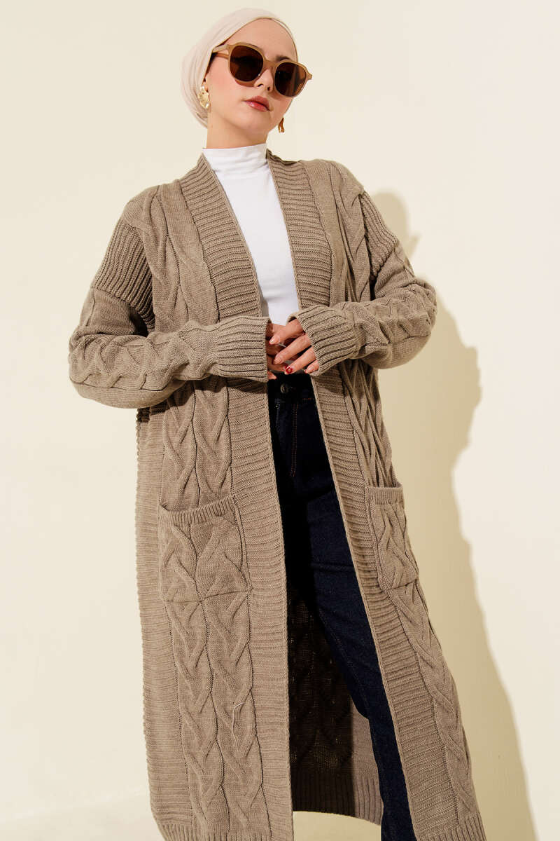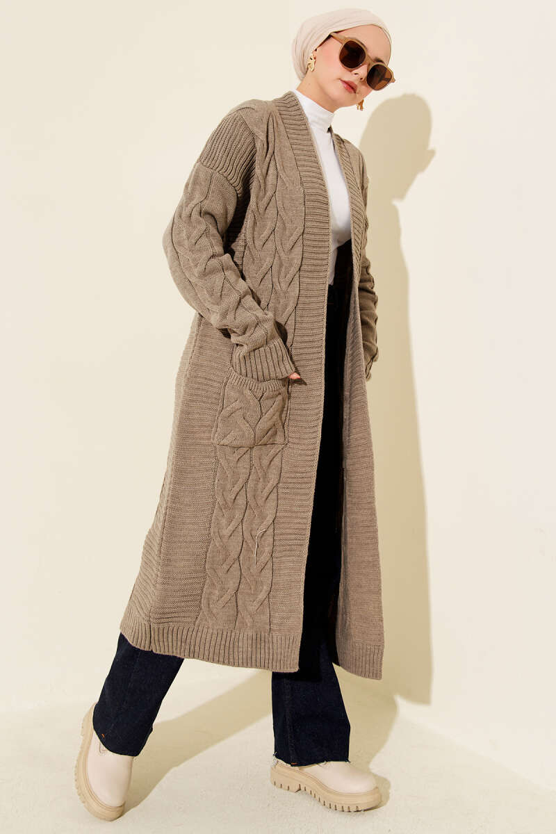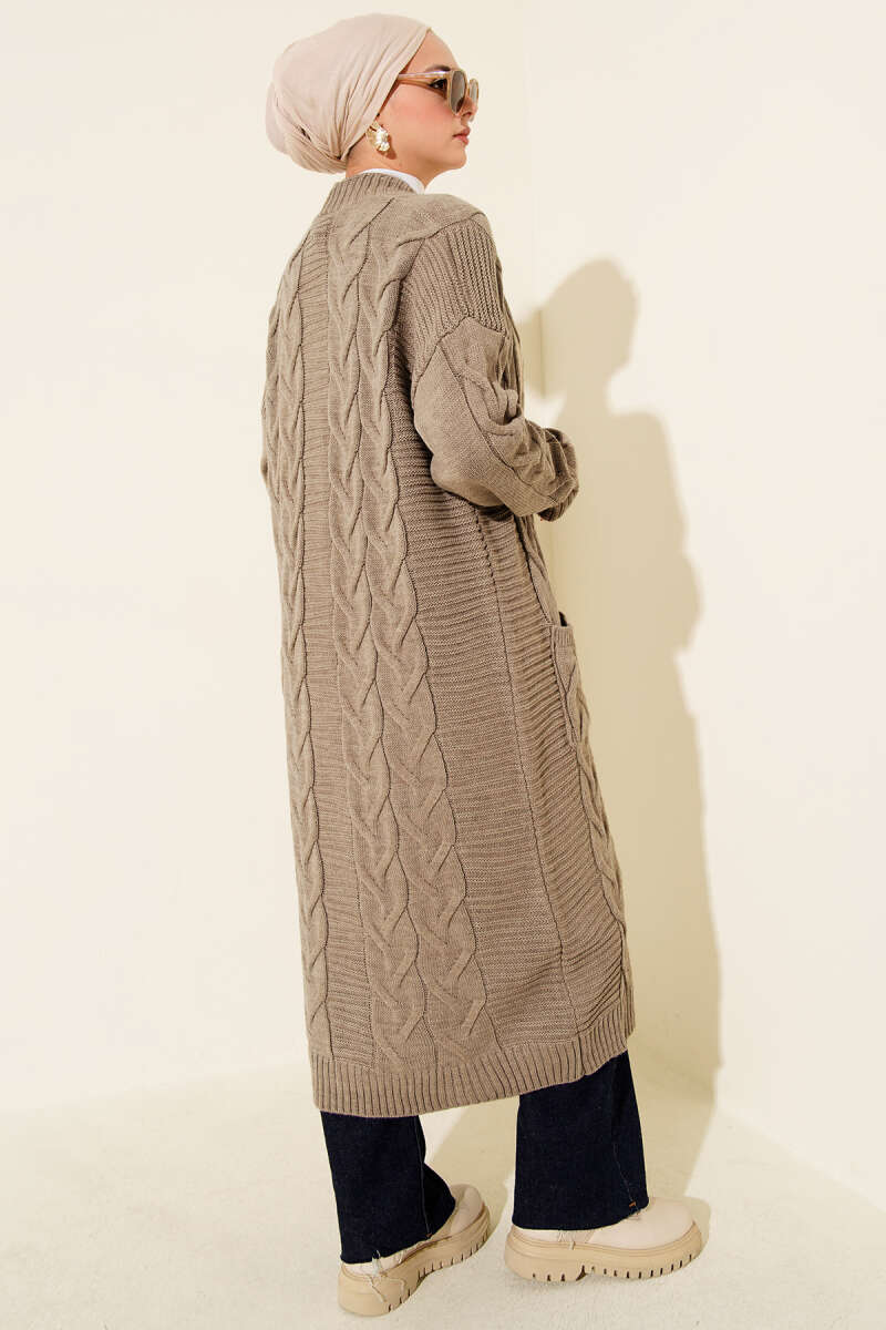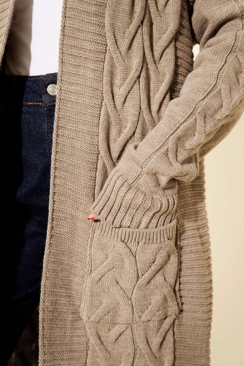 Şal Yaka Örgü Desenli Uzun Triko Hırka Füme