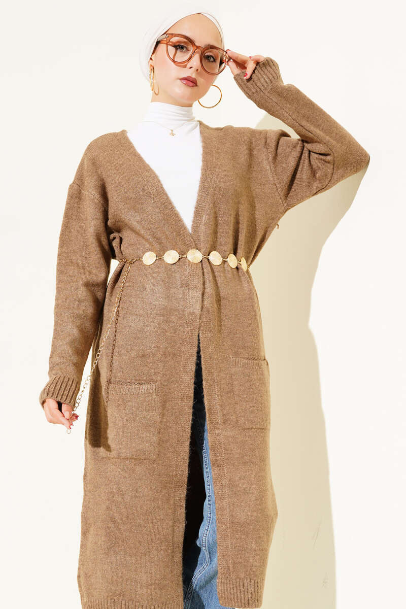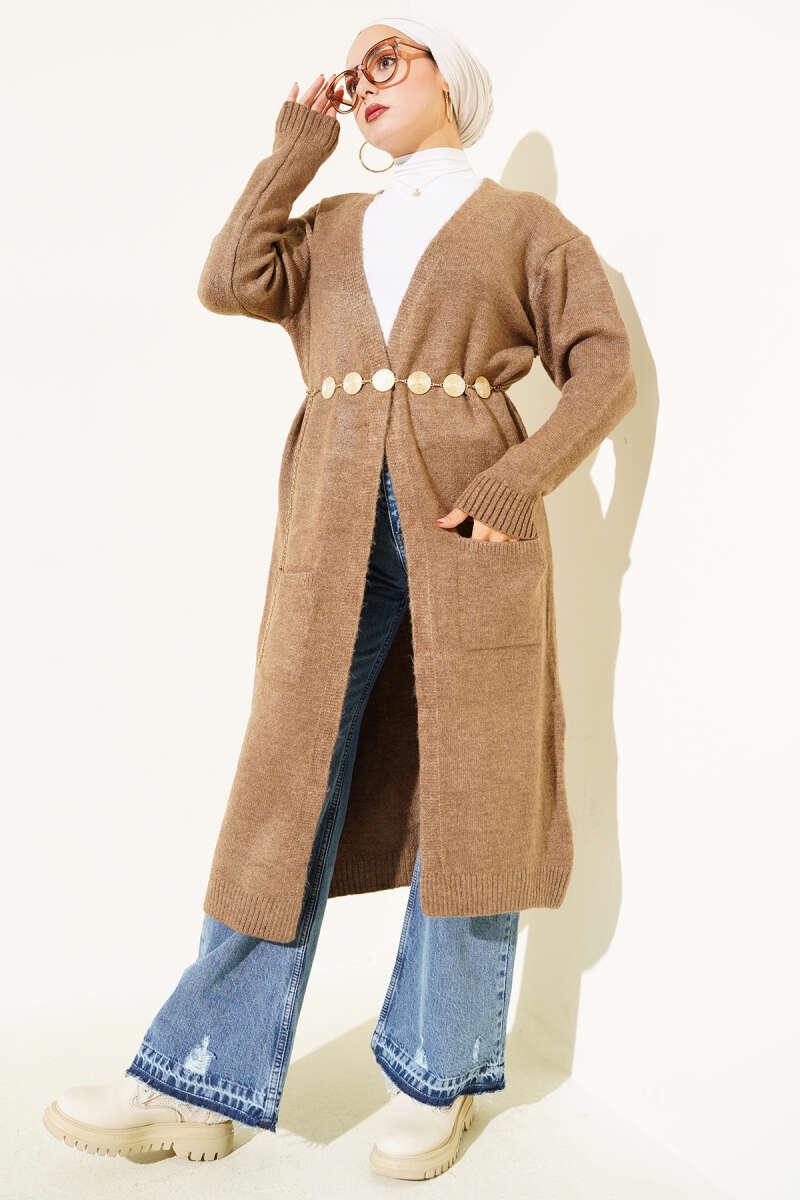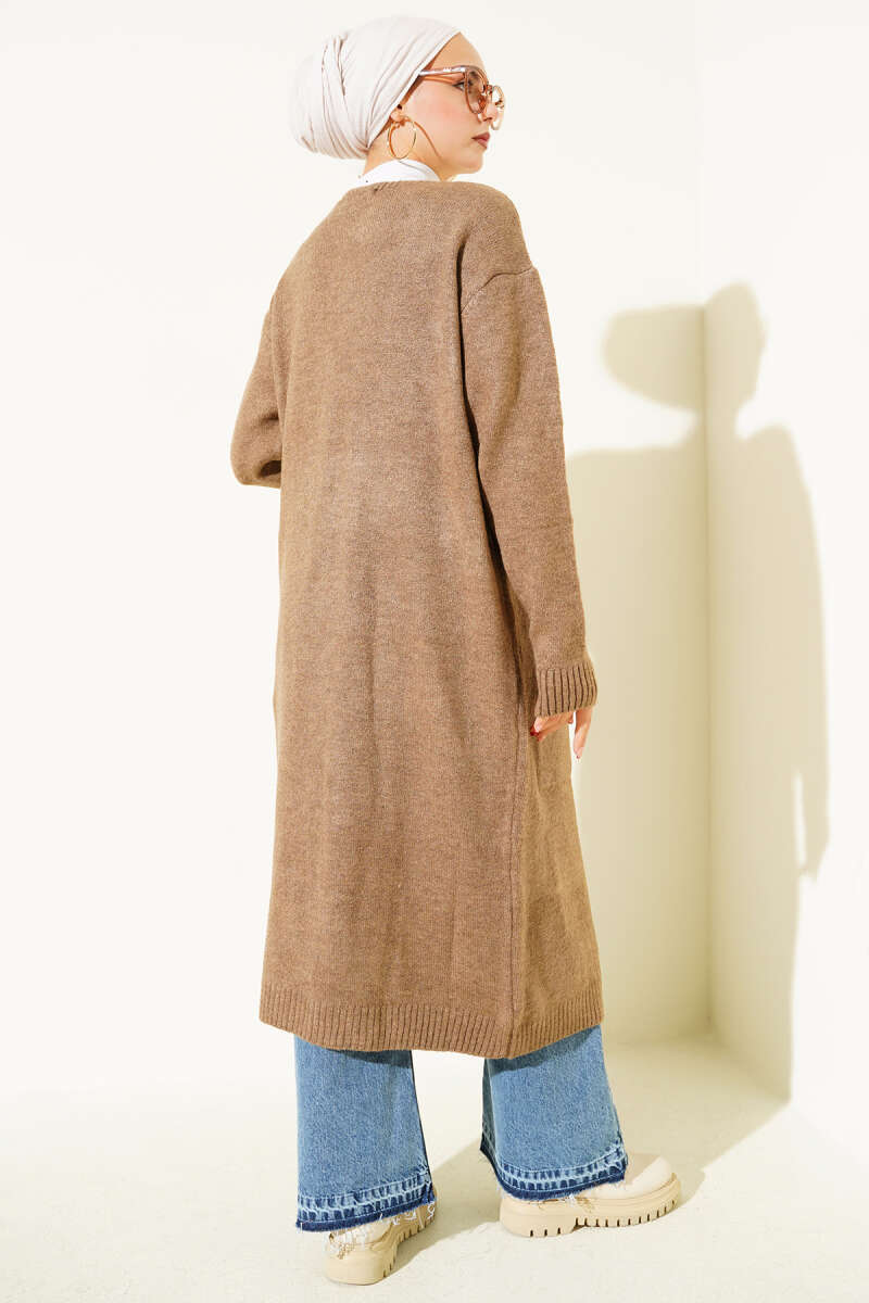Çift Cepli Metal Düğmeli Kapüşonlu Hırka Kahve