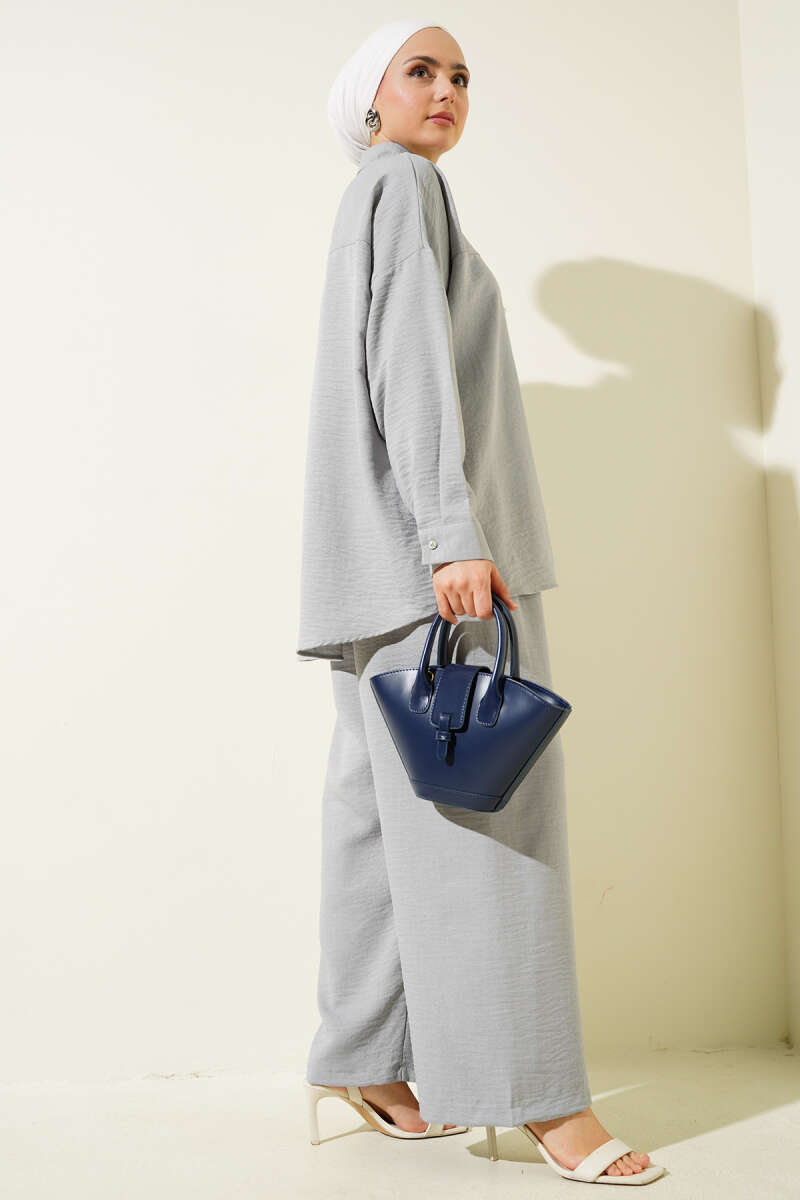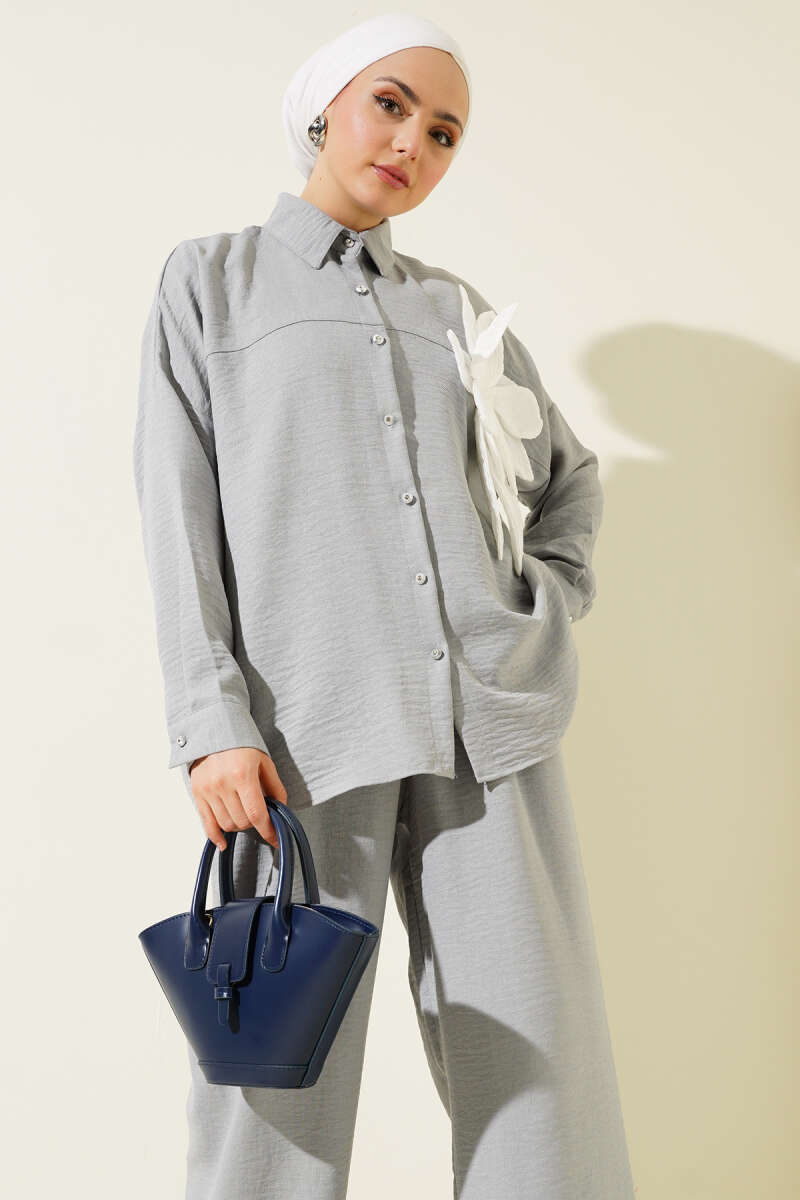 Çiçek Aksesuarlı Tunik İkili Takım Gri