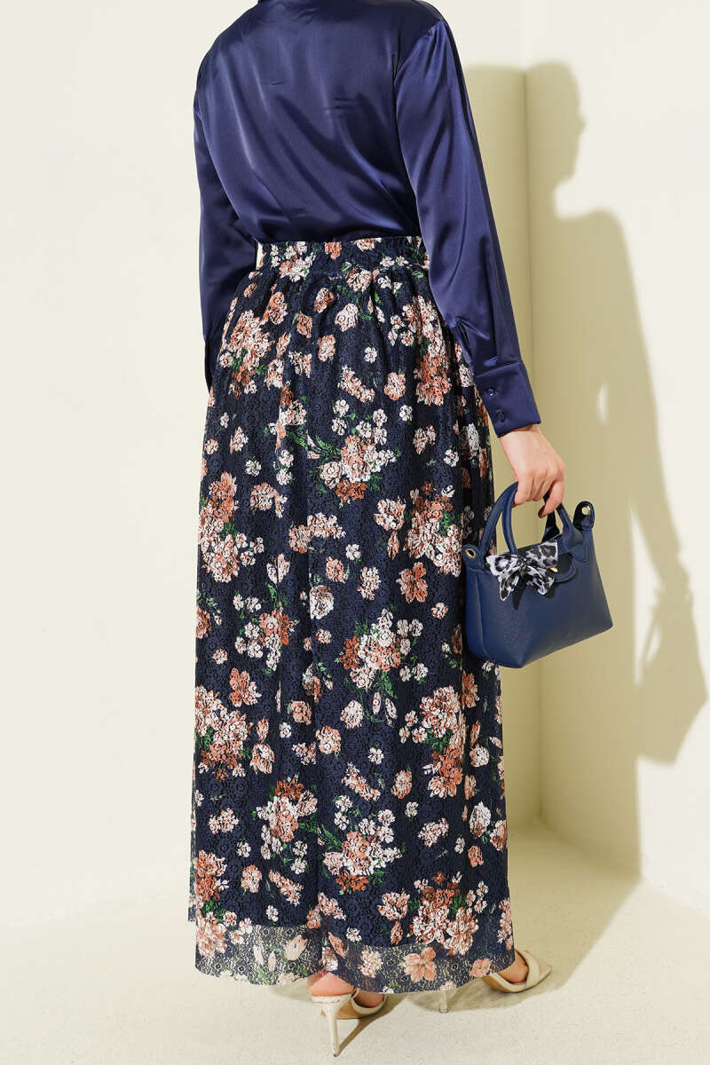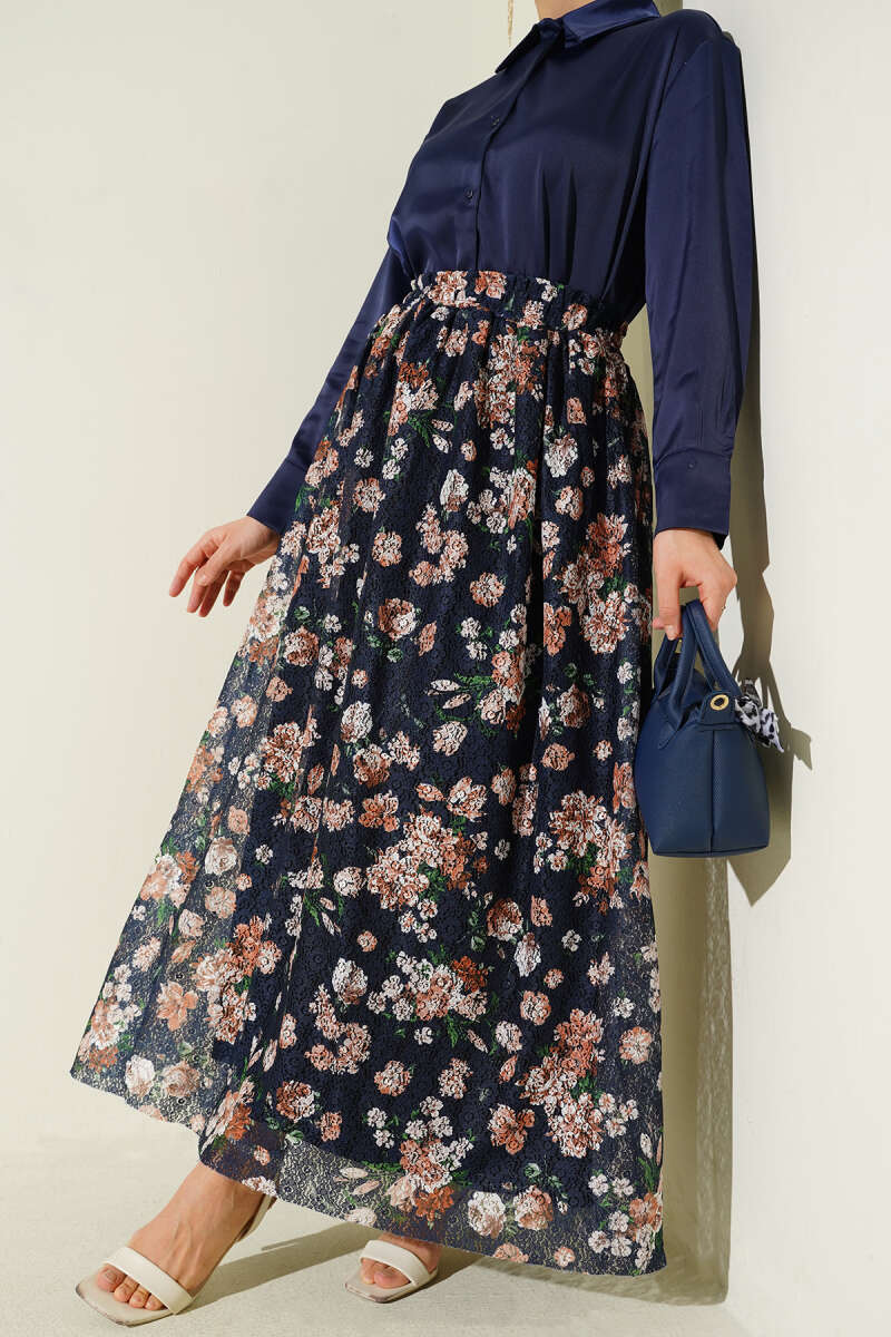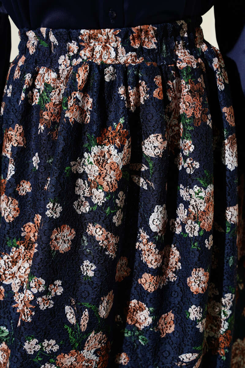 Çiçek Baskılı Güpürlü Etek Siyah