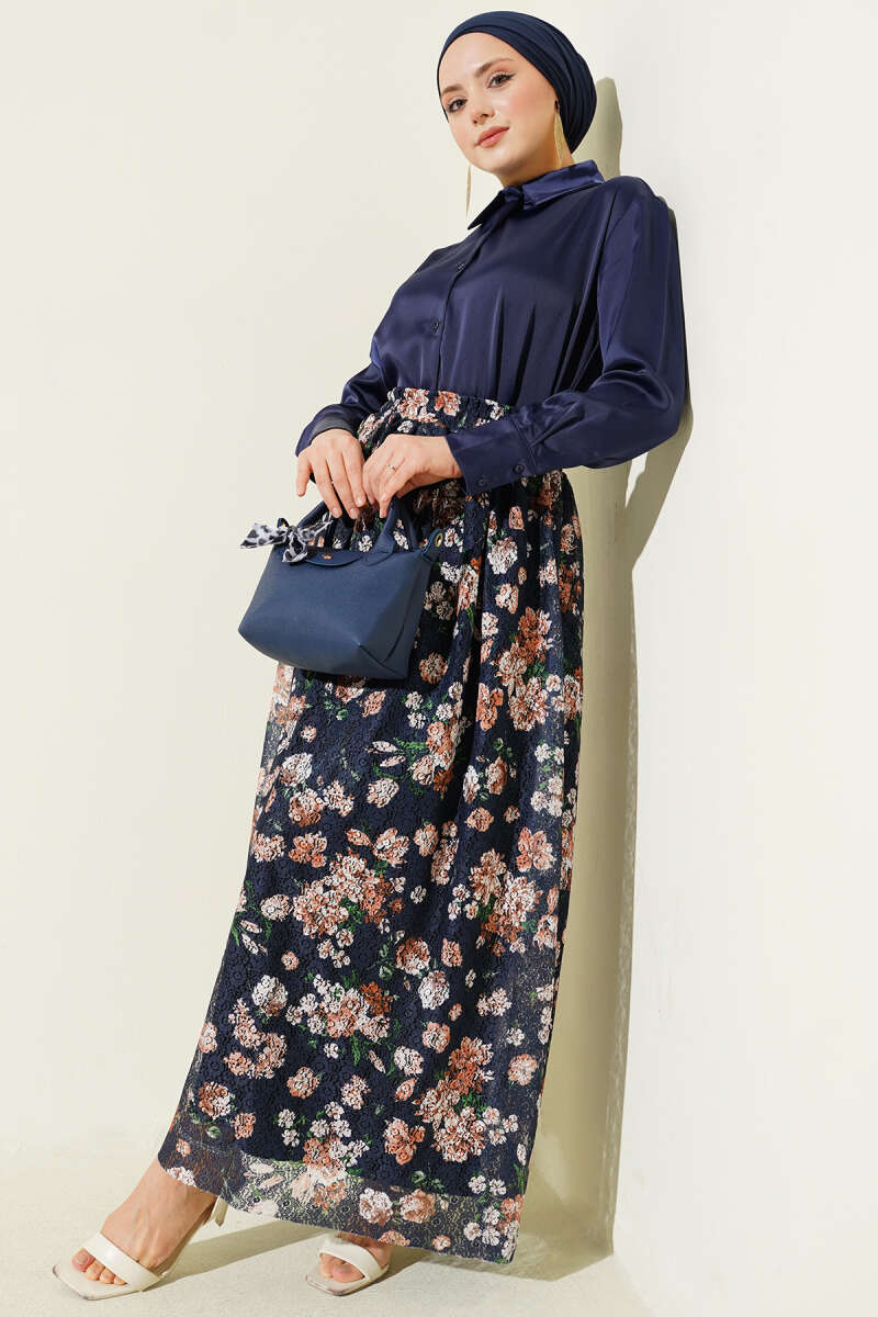 Kemerli Bel Lastikli Tensel Etek Lacivert