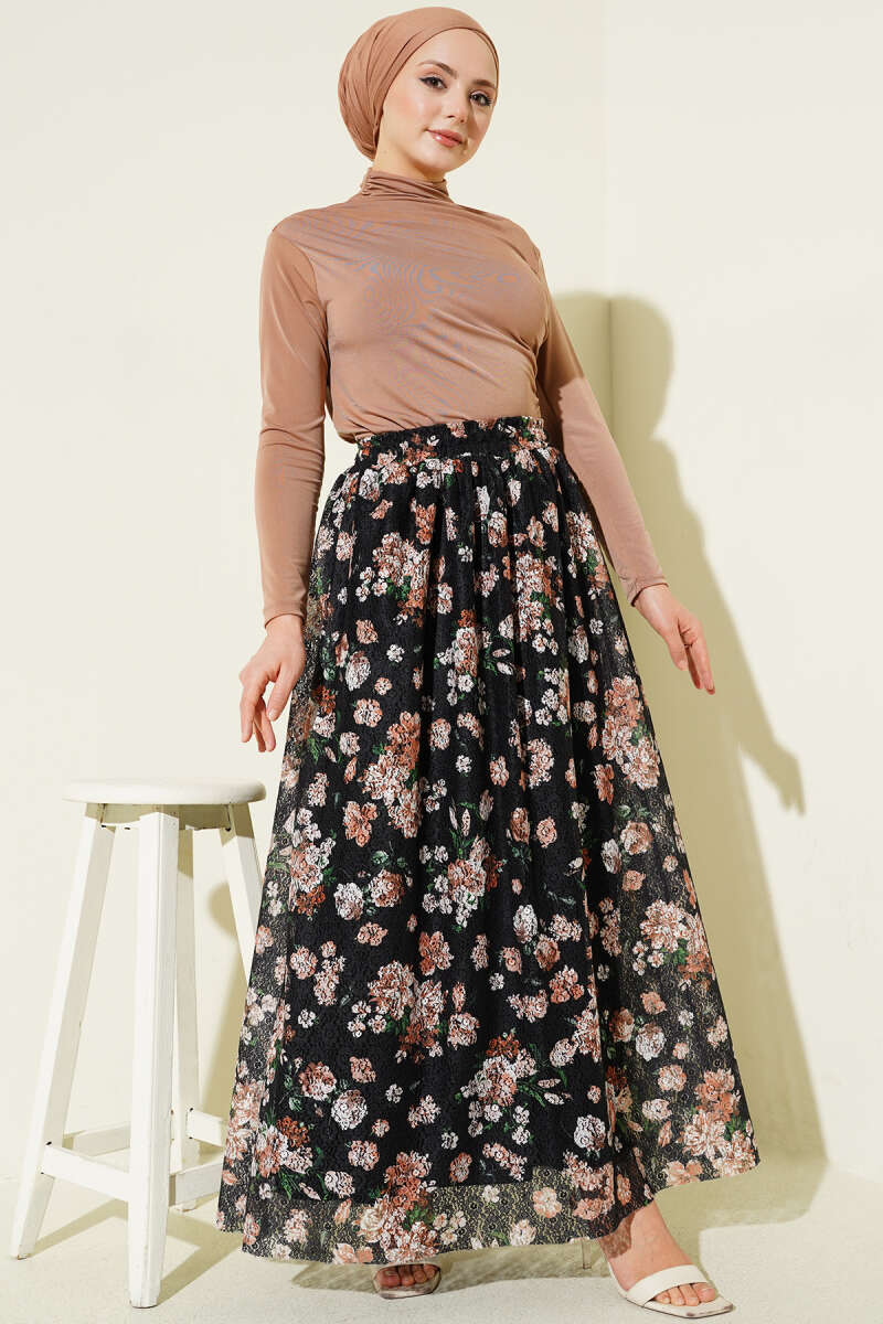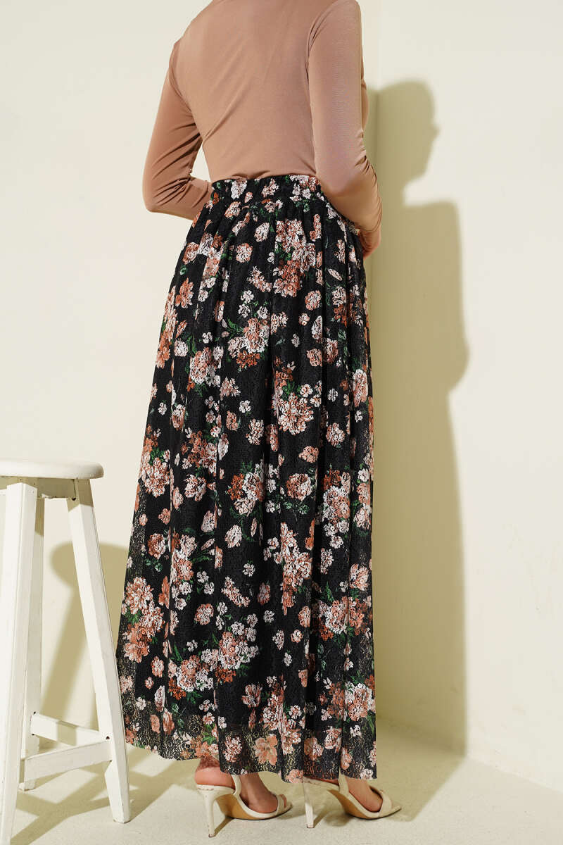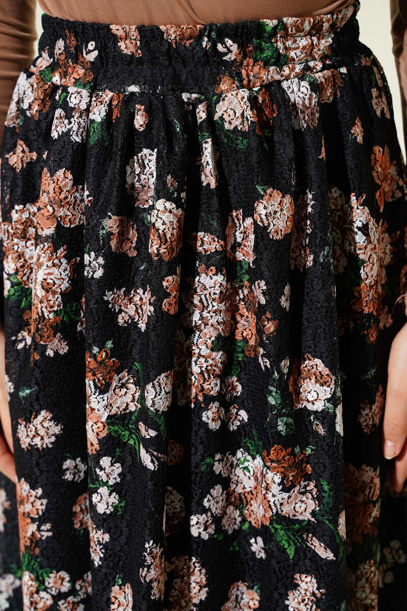Çiçek Baskılı Güpürlü Etek Kahve