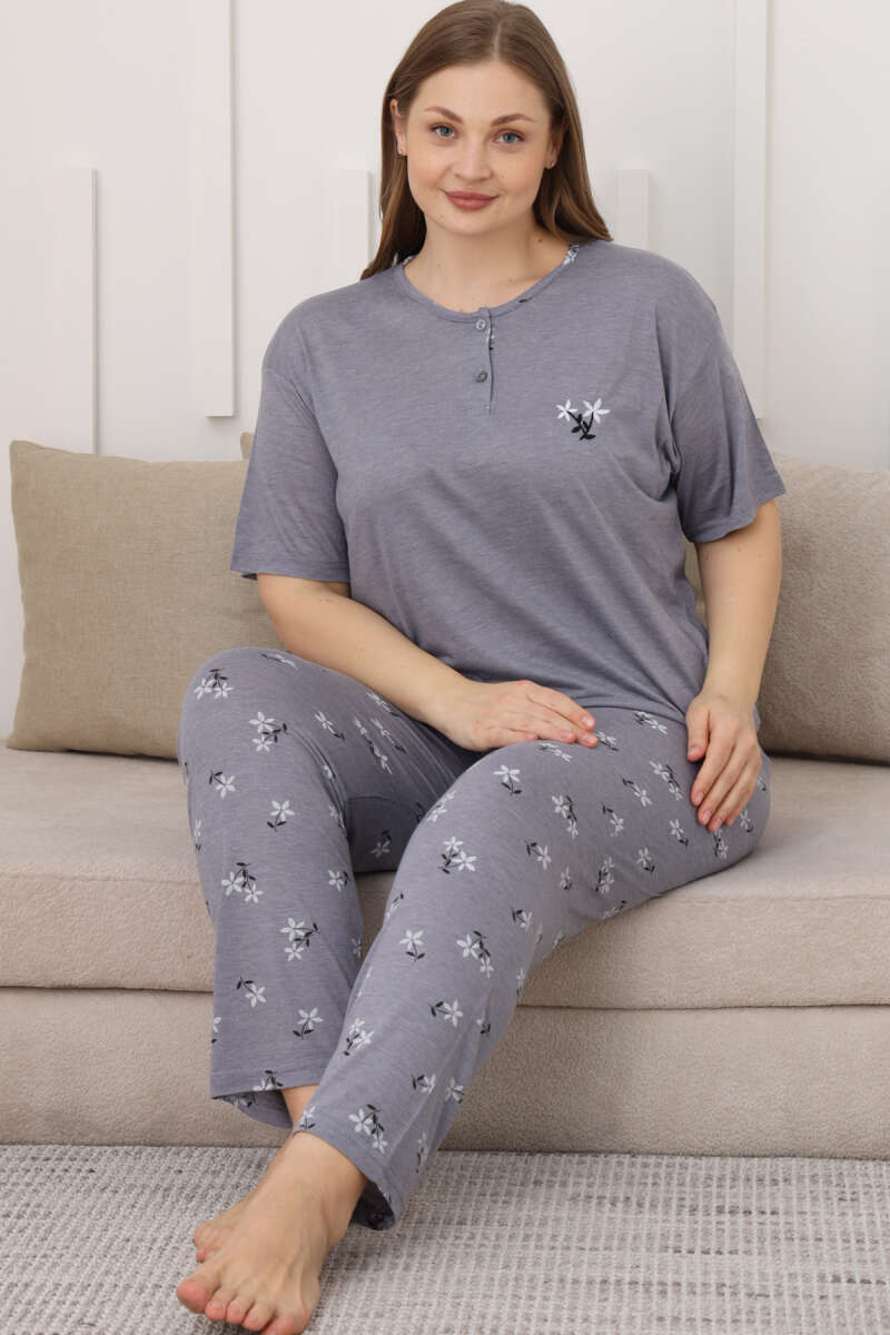 Çiçek Baskılı Kısa Kol Büyük Beden Pijama Takım Leylak
