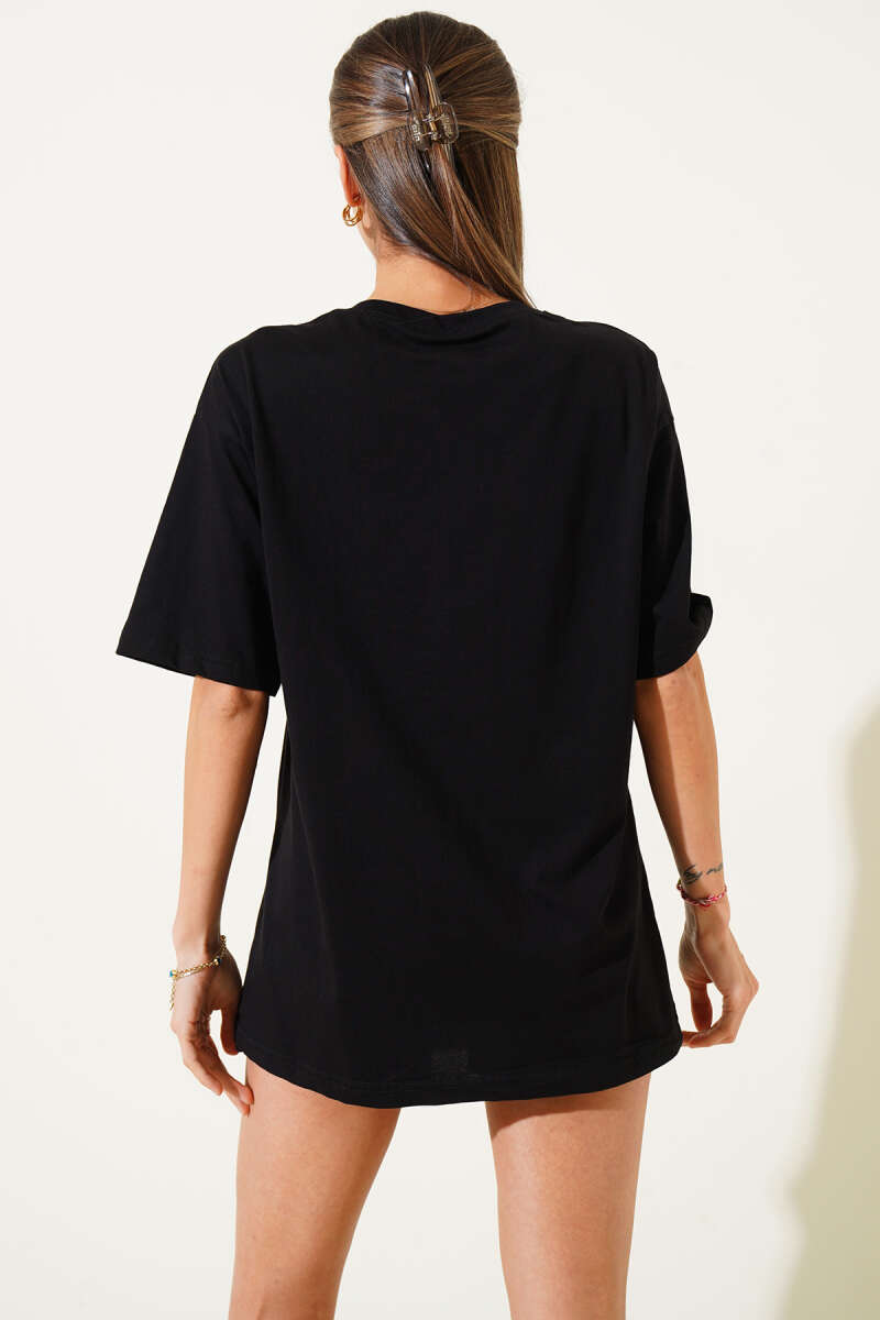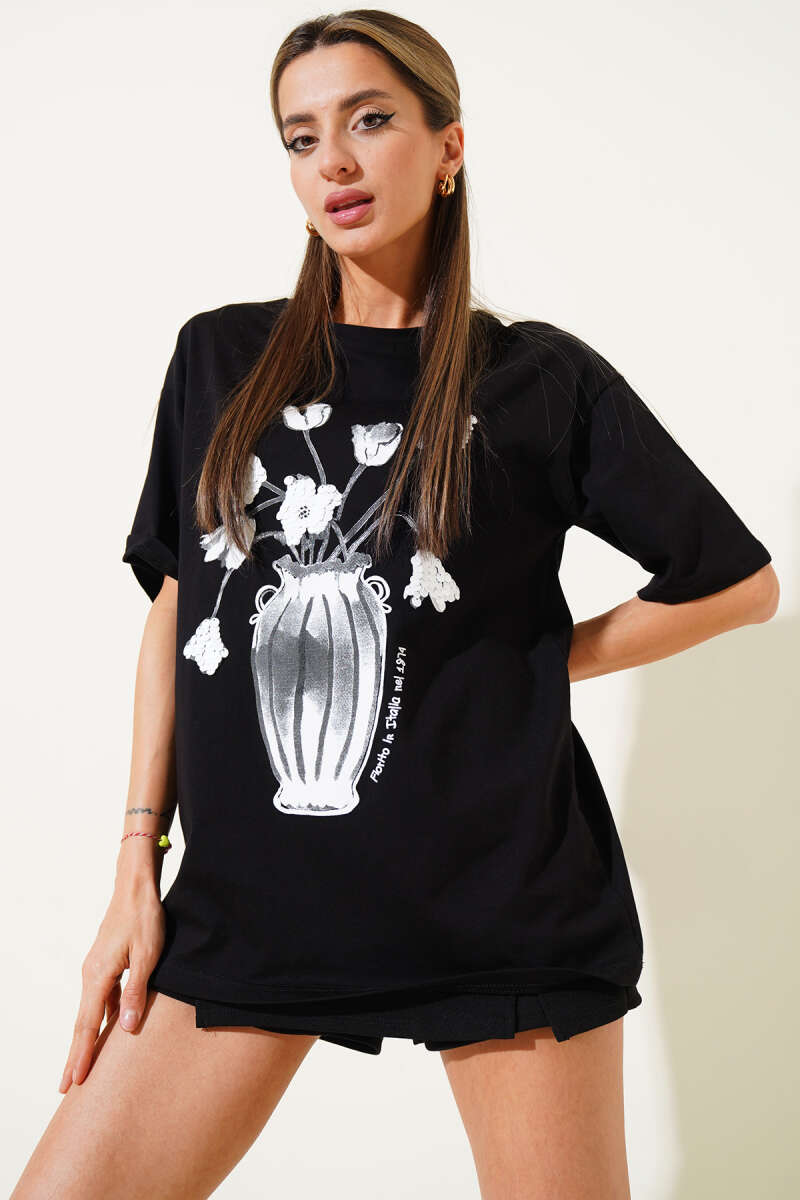 Çiçek Baskılı Pullu T-shirt Siyah