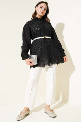 Gizli Düğmeli Bel Kuşaklı Gömlek Beyaz