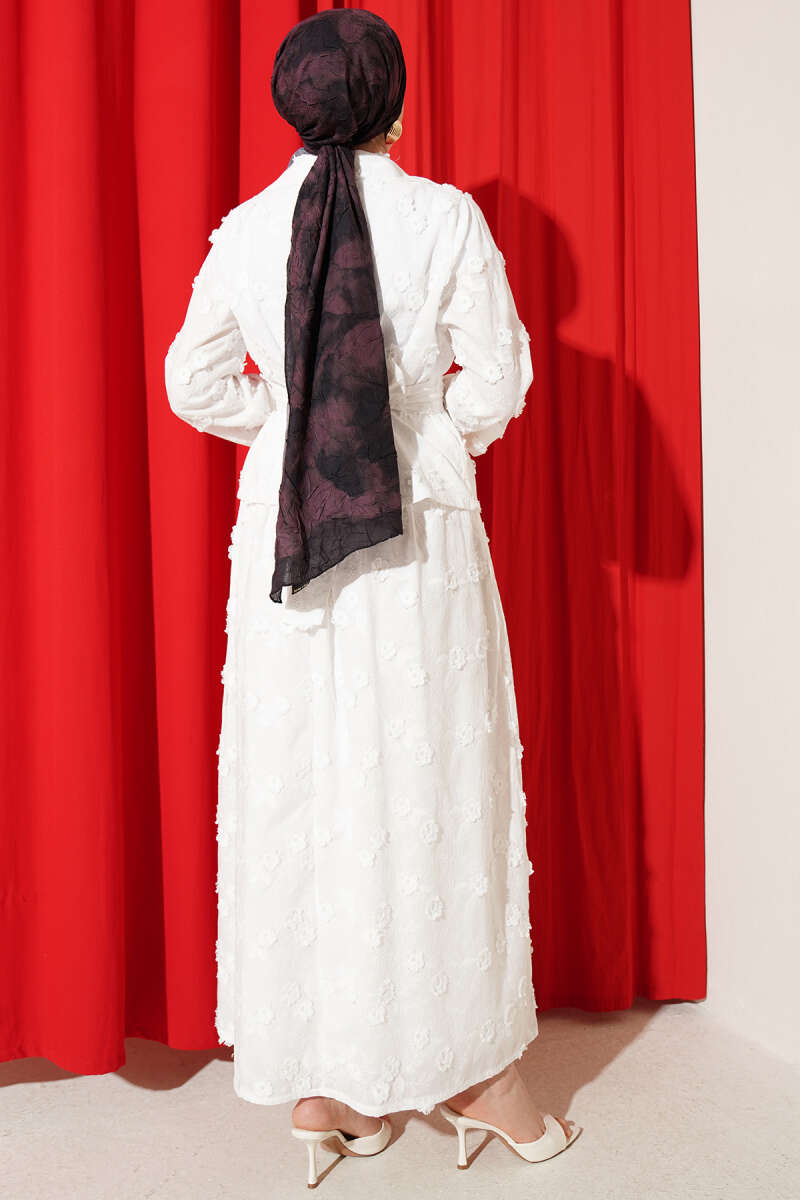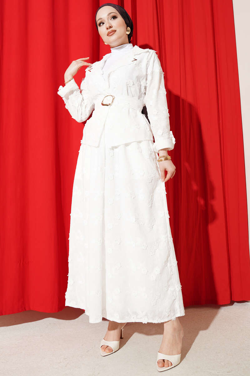 Üzerindeki zarif çiçek brode işlemeleriyle dikkat çeken bu ikili takım, hem klasik hem de modern bir şıklığı bir arada sunuyor. Ceket formundaki üst parça, beldeki kemer detayıyla vücut hatlarını naifçe vurgularken, geniş kesimli etek tasarımı gün boyu konforlu bir hareket alanı sağlıyor. Özel davetlerden şık akşam yemeklerine kadar pek çok ortamda tercih edilebilecek bu takım, dokulu kumaş yapısıyla sofistike bir duruş sergiliyor. Gardırobunuzun en seçkin parçalarından biri olmaya aday olan bu tasarım, zarafeti ve asaleti tek bir kombinde birleştiriyor.