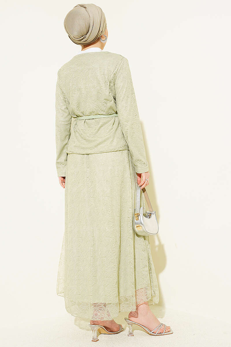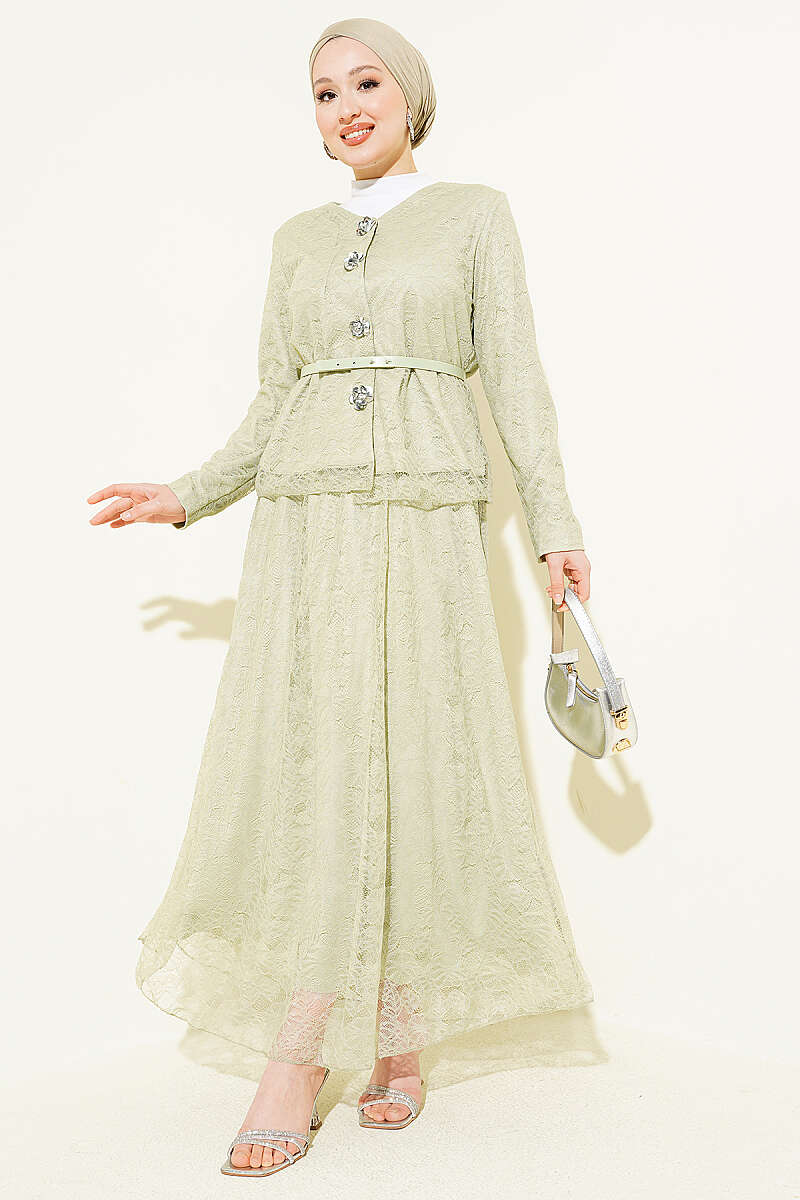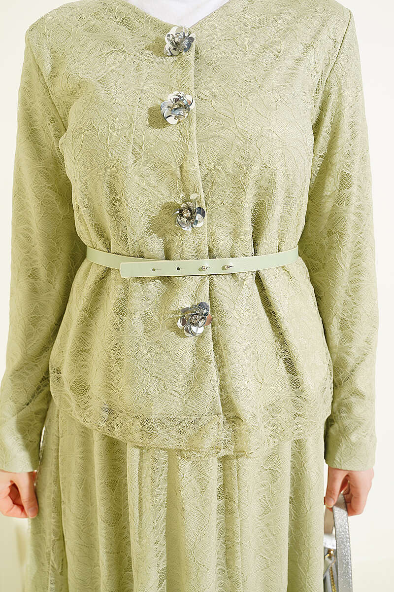 Çiçek Çıtçıtlı Dantelli Etekli İkili Takım Çağla Yeşili