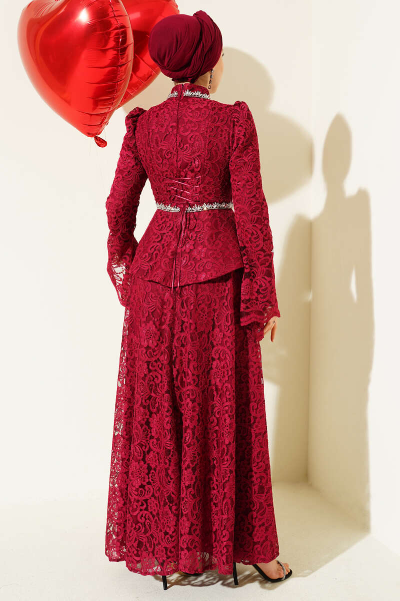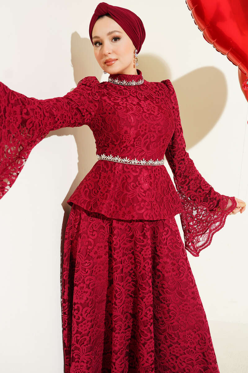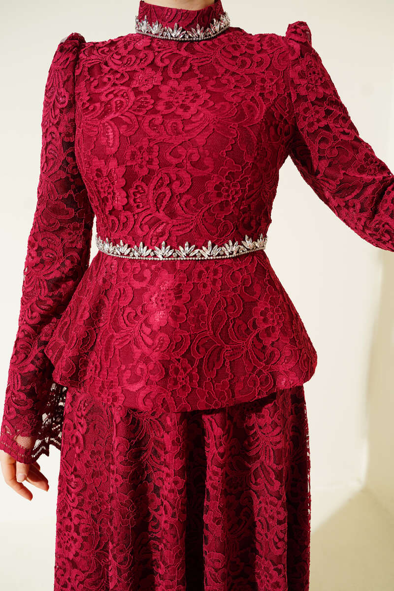 Çiçek Dantelli Taşlı Abiye İkili Takım Bordo