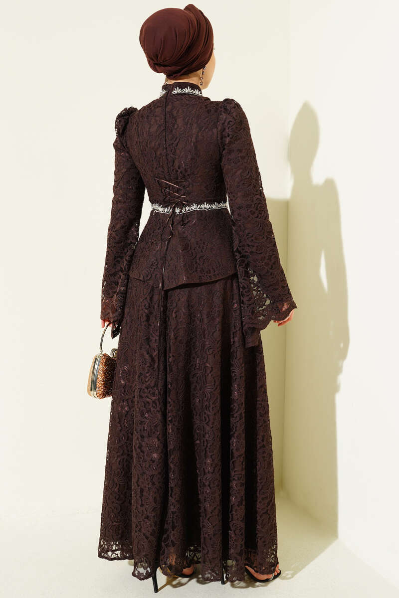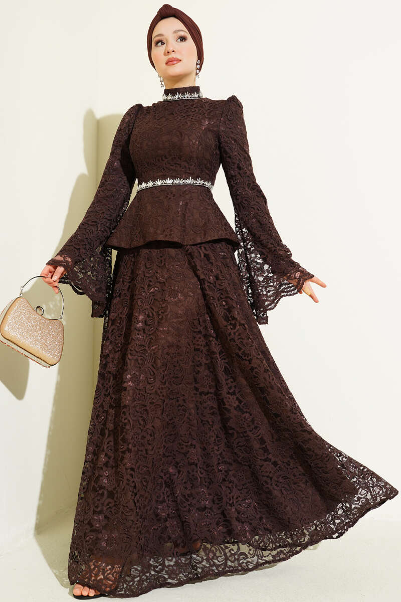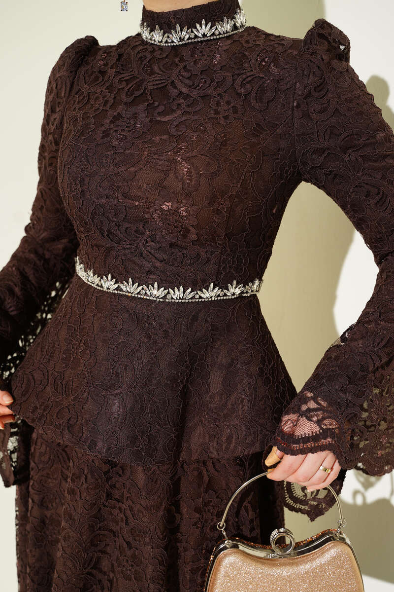Çiçek Dantelli Taşlı Abiye İkili Takım Kahve