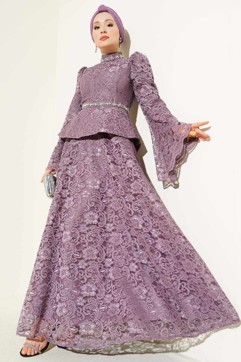 Çiçek Dantelli Taşlı Abiye İkili Takım Bordo