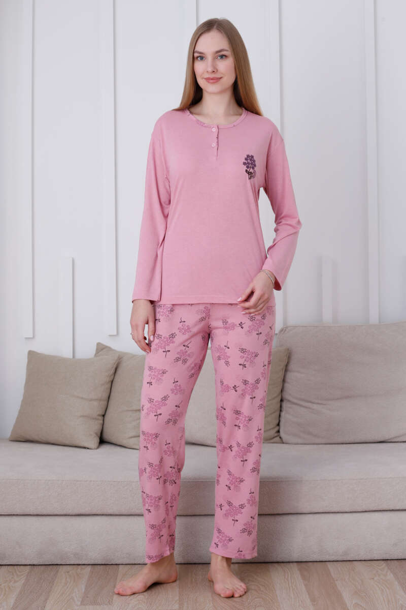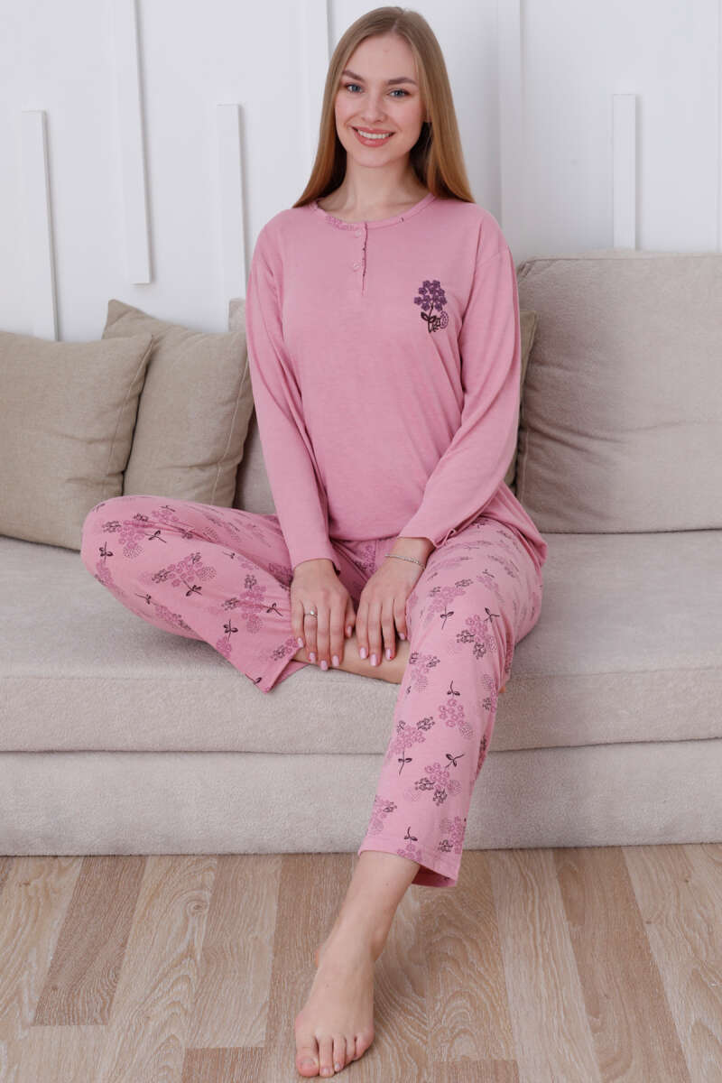 Çiçek Demetli Düğmeli Uzun Kol Pijama Takım Gül Kurusu