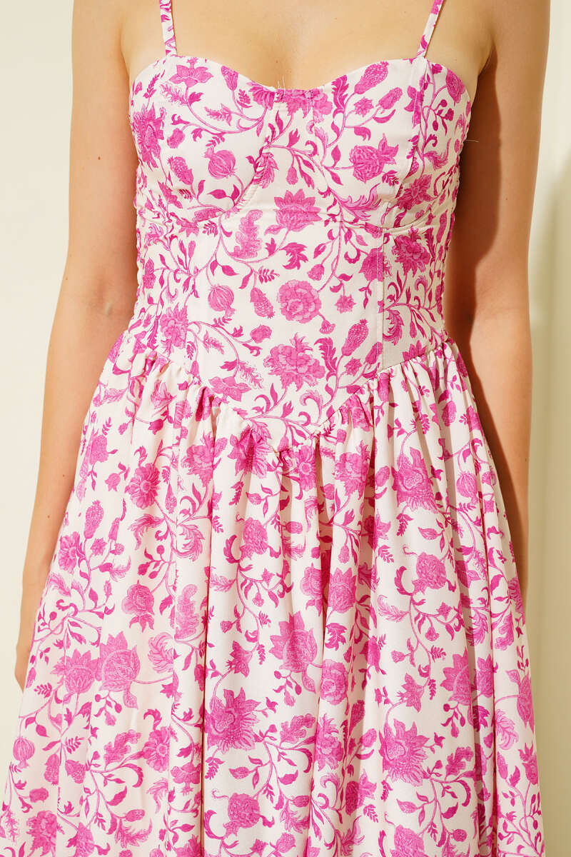 Çiçek Desen Askılı Midi Elbise Fuşya