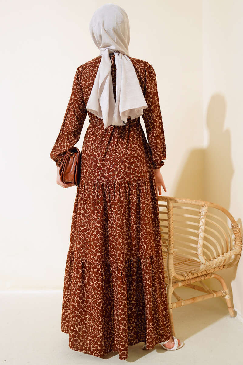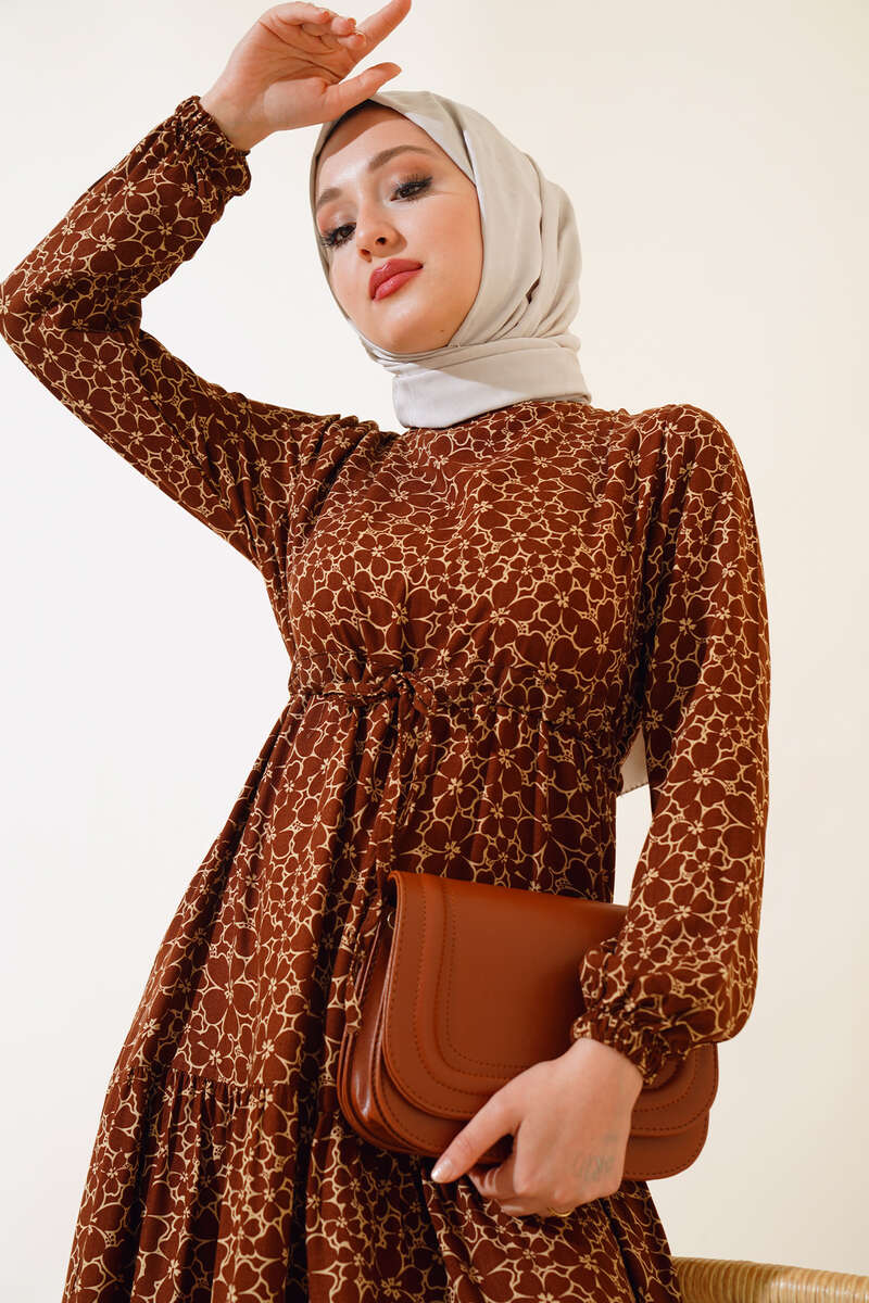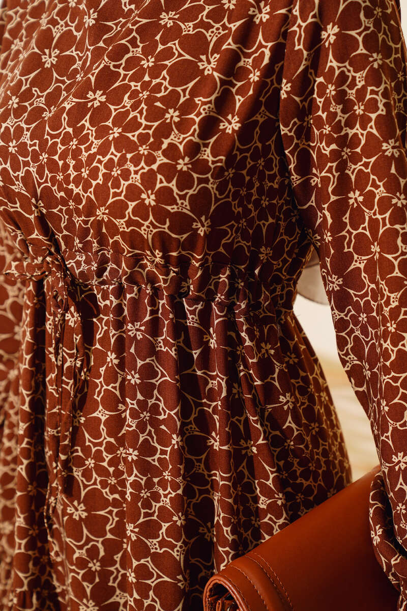 Çiçek Desen Bel Tünelli Elbise Kahve