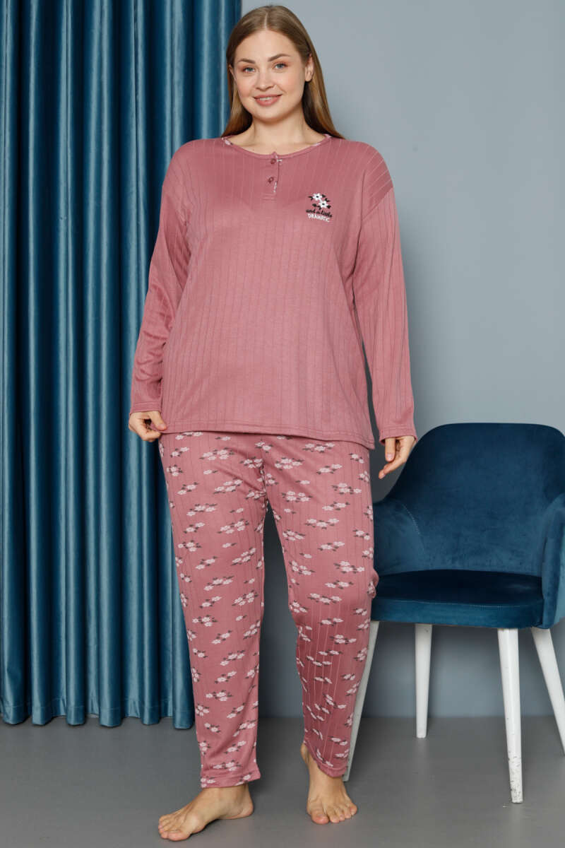 Çiçek Desen Fitilli Büyük Beden Pijama Takımı Gül Kurusu