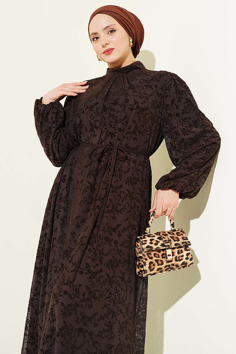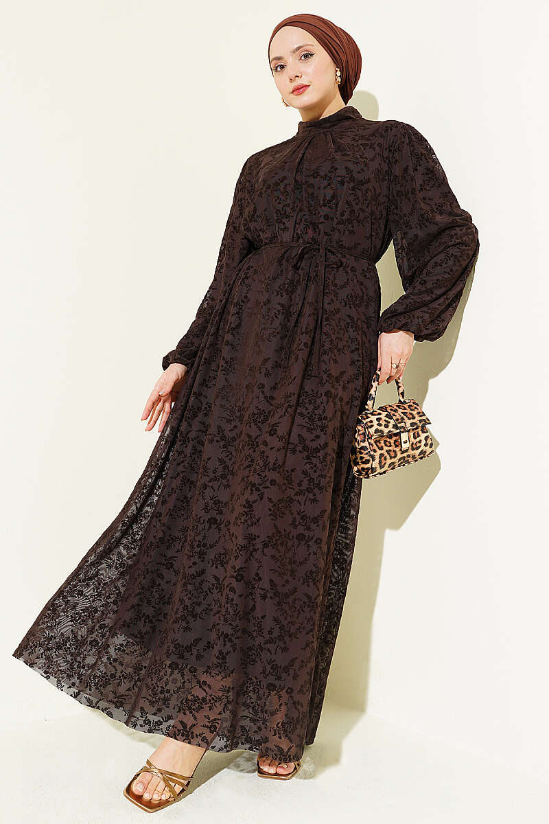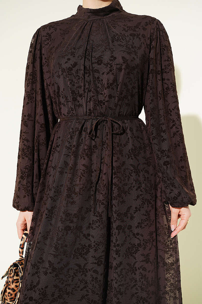 Çiçek Desen İp Kuşaklı Tül Elbise Kahve