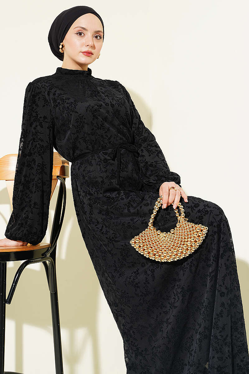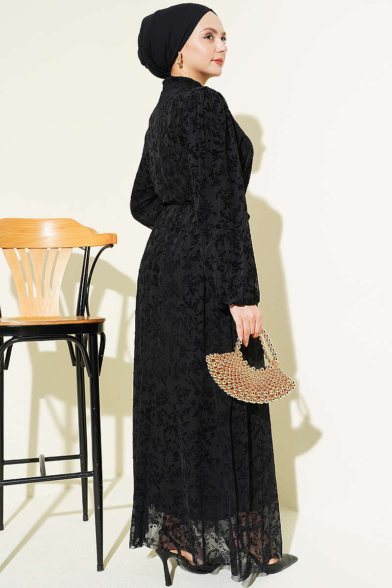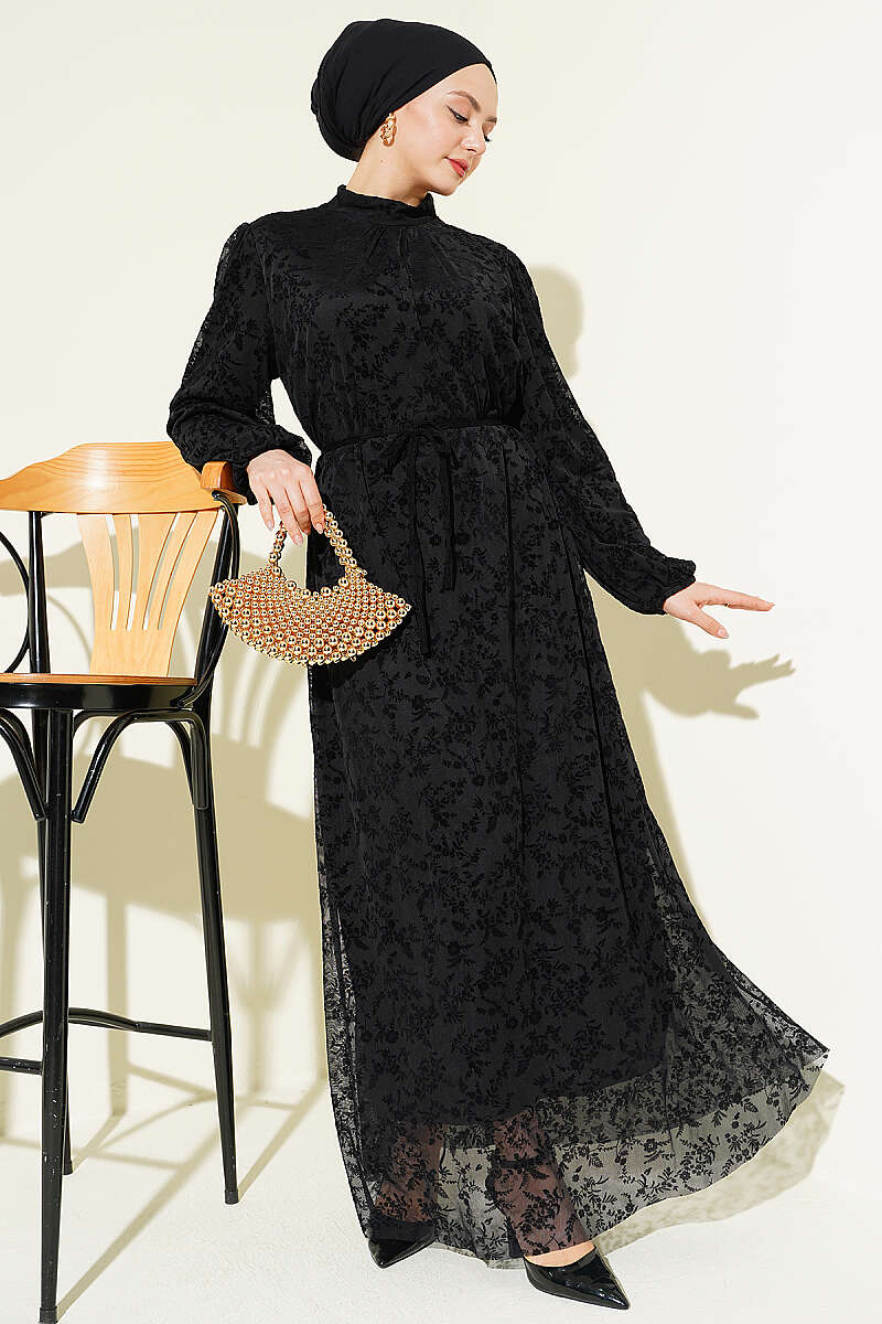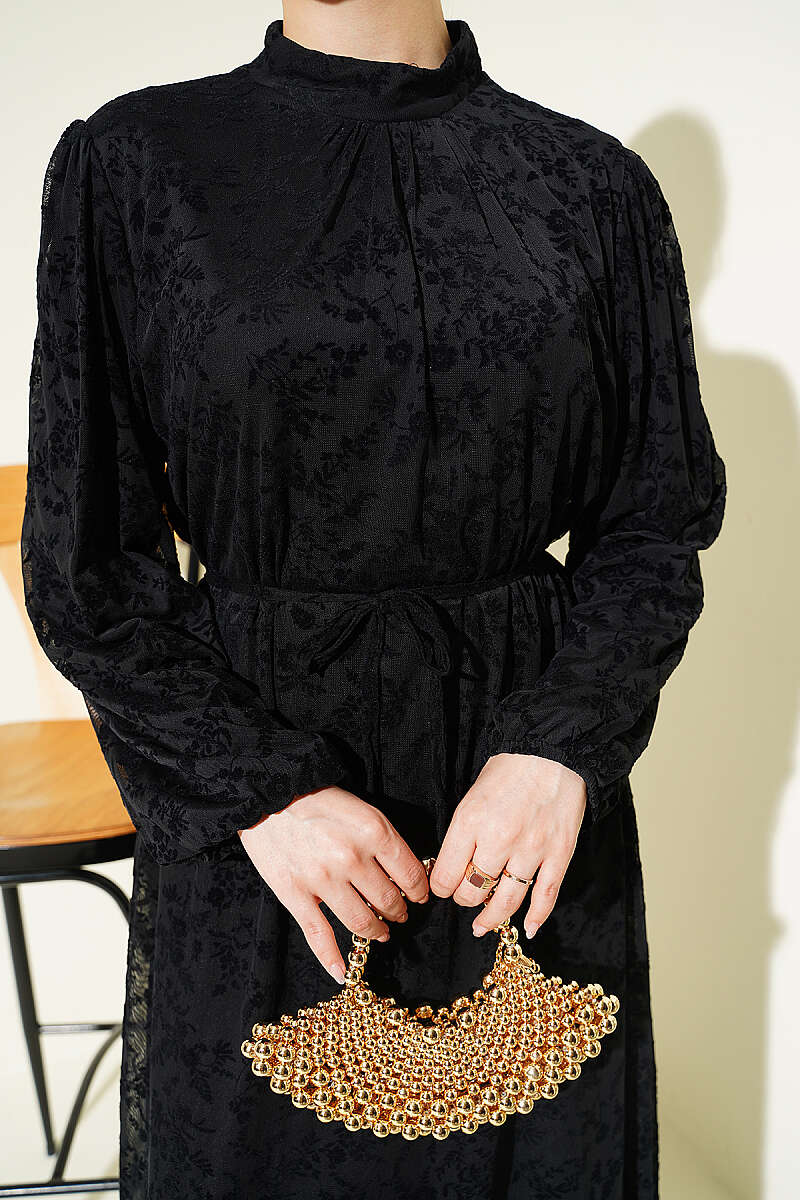 Zarif bir doku sunan bu çiçek desenli tül elbise, romantik ve sofistike bir tarzı modern çizgilerle bir araya getiriyor. Bel kısmındaki ip kuşak detayı, silüeti incelterek vücut formunu zarifçe vurgularken, tül kumaşın dökümlü yapısı her adımda uçuş uçuş bir hareketlilik sağlıyor. Hakim yakası ve hafif balon kol tasarımıyla klasik bir şıklık sunan bu parça, özel davetlerden şık akşam yemeklerine kadar geniş bir yelpazede tercih edilebilir. Tasarımındaki ince işlenmiş desenler, minimal aksesuarlarla bile göz alıcı ve asil bir görünüm elde etmenize olanak tanıyor.