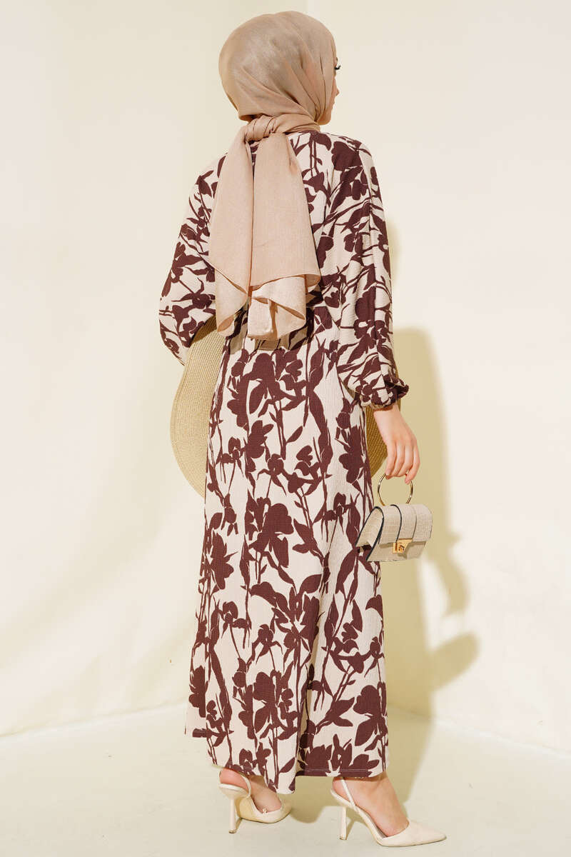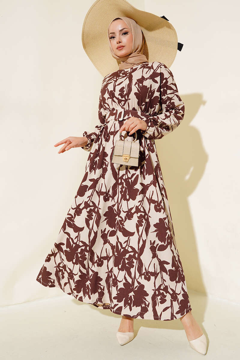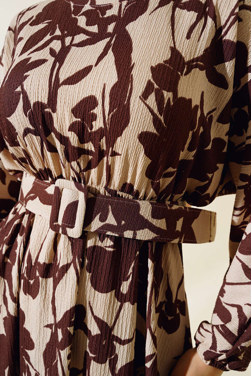 Çiçek Desen Kemerli Bürümcük Elbise Kahve
