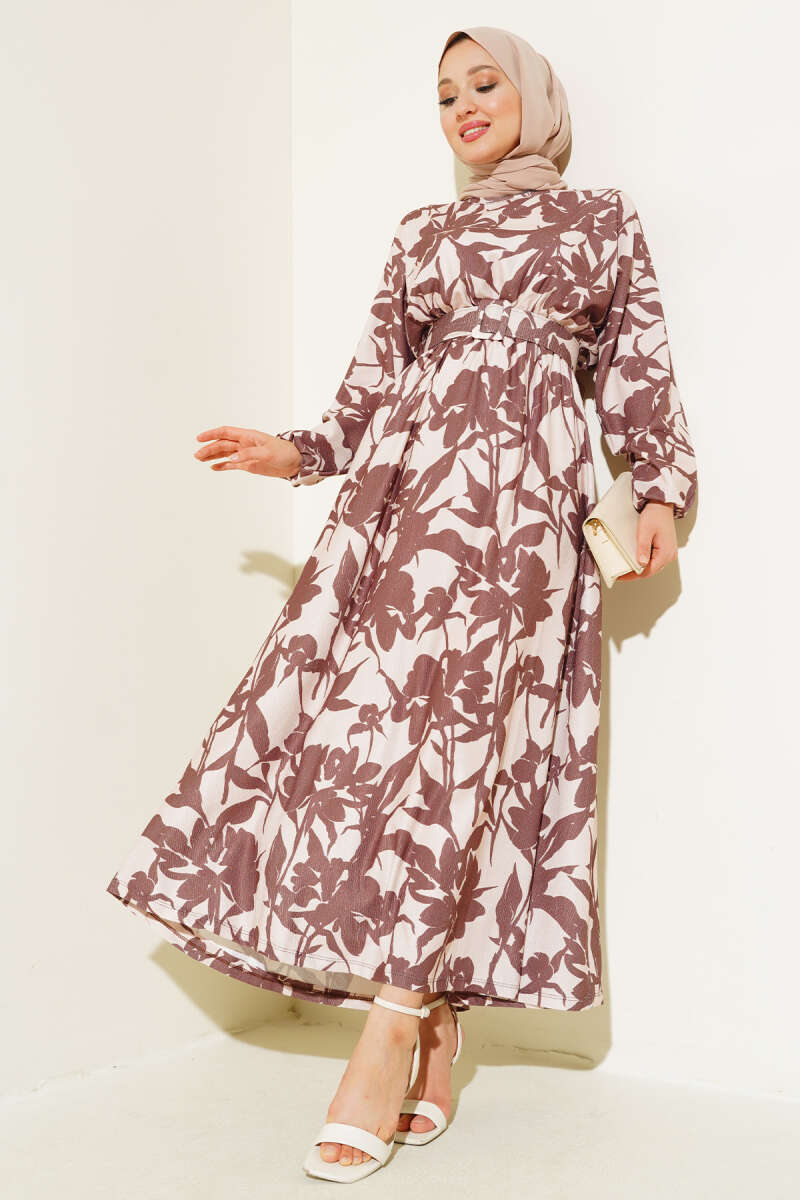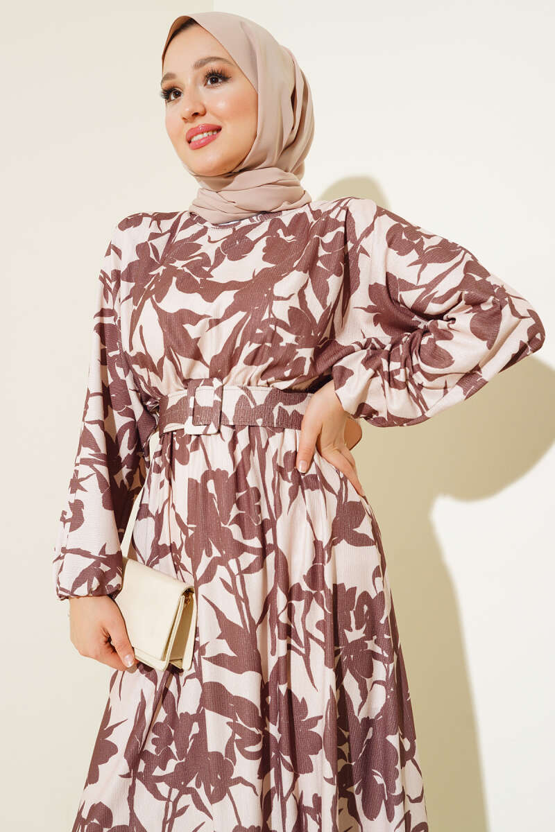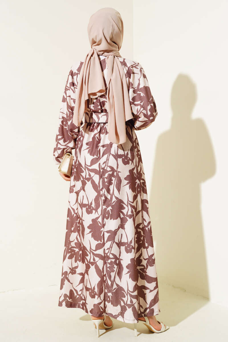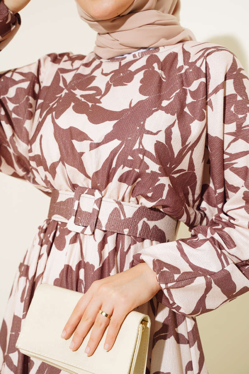 Çiçek Desen Kemerli Bürümcük Elbise Kestane