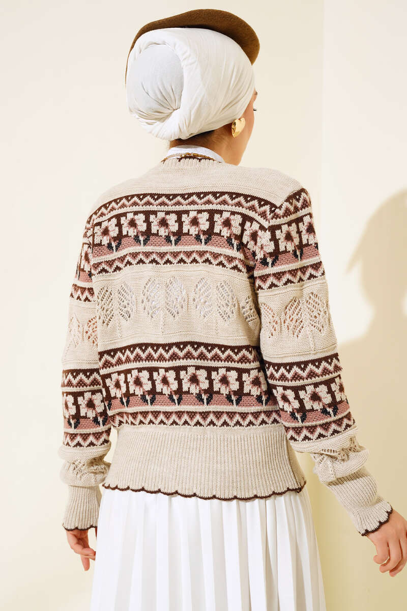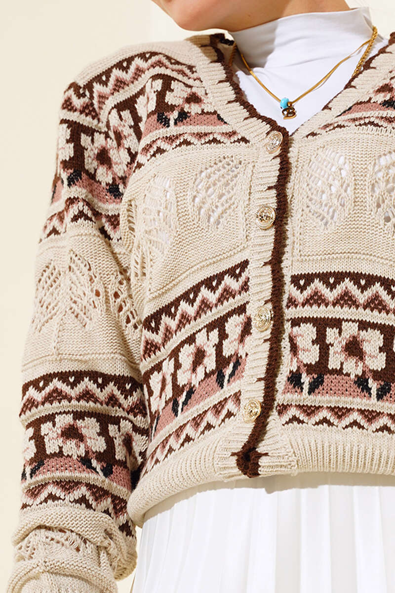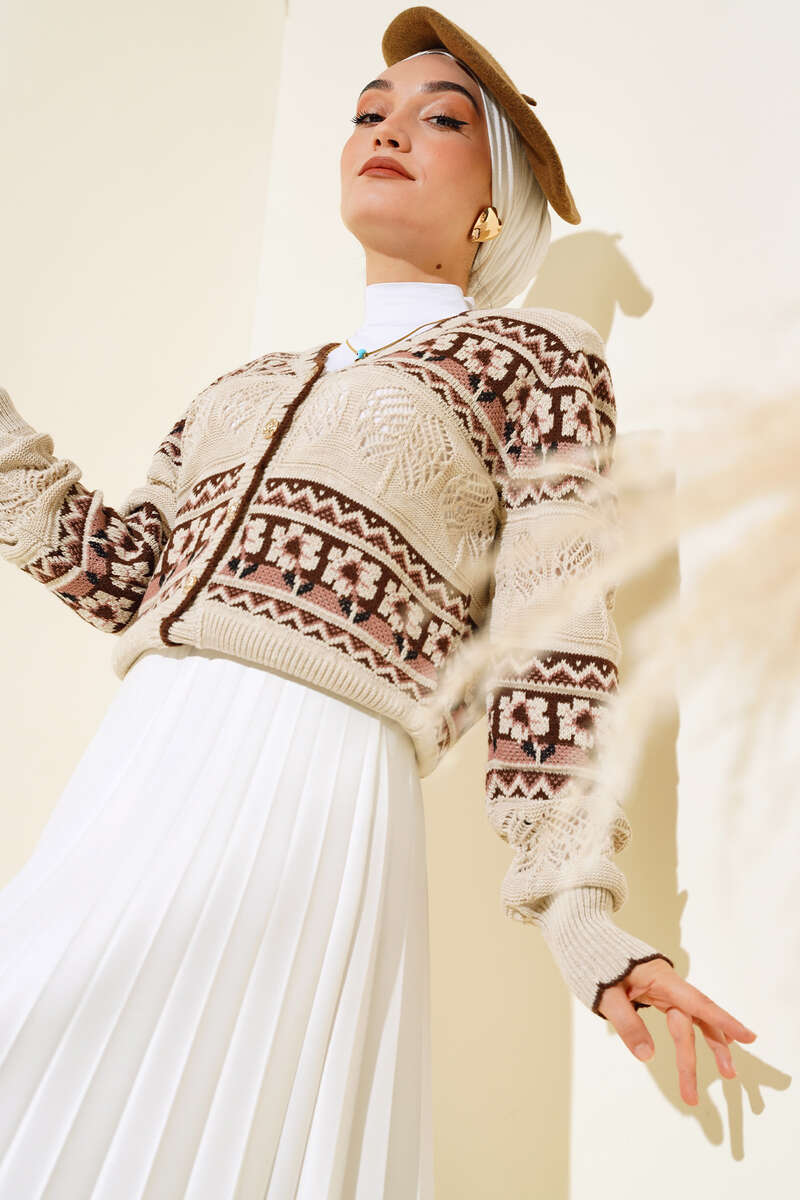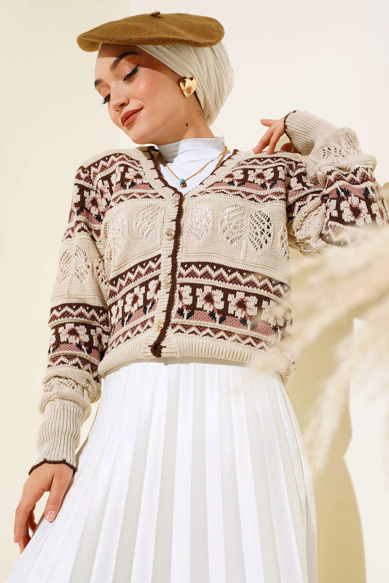 Saç Örgülü Düğmeli Triko Hırka Bej