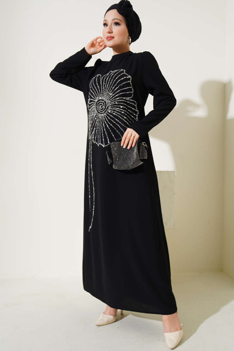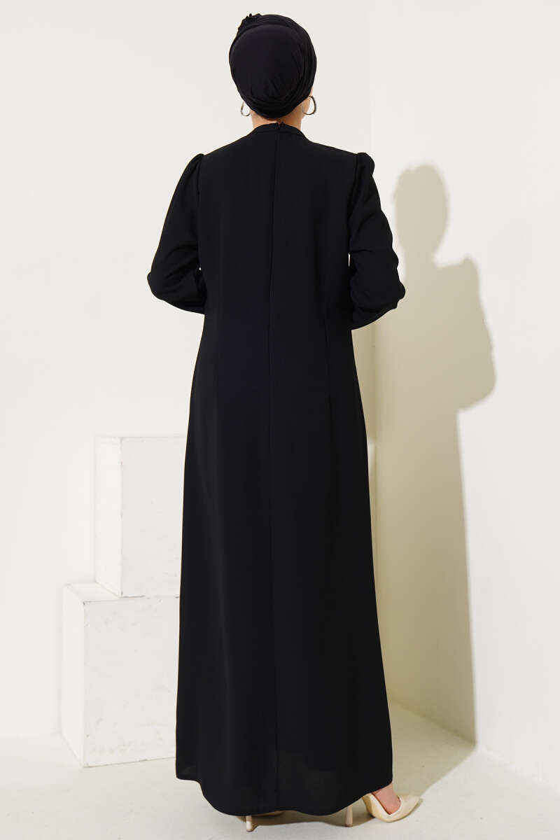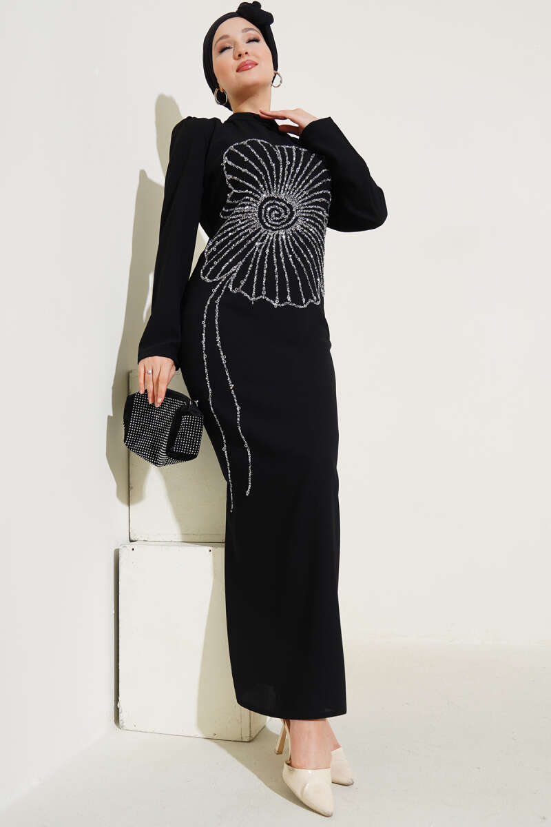 Çizgi Gömlek Garnili Triko Elbise Siyah