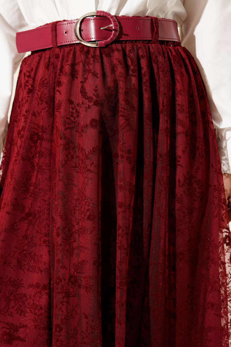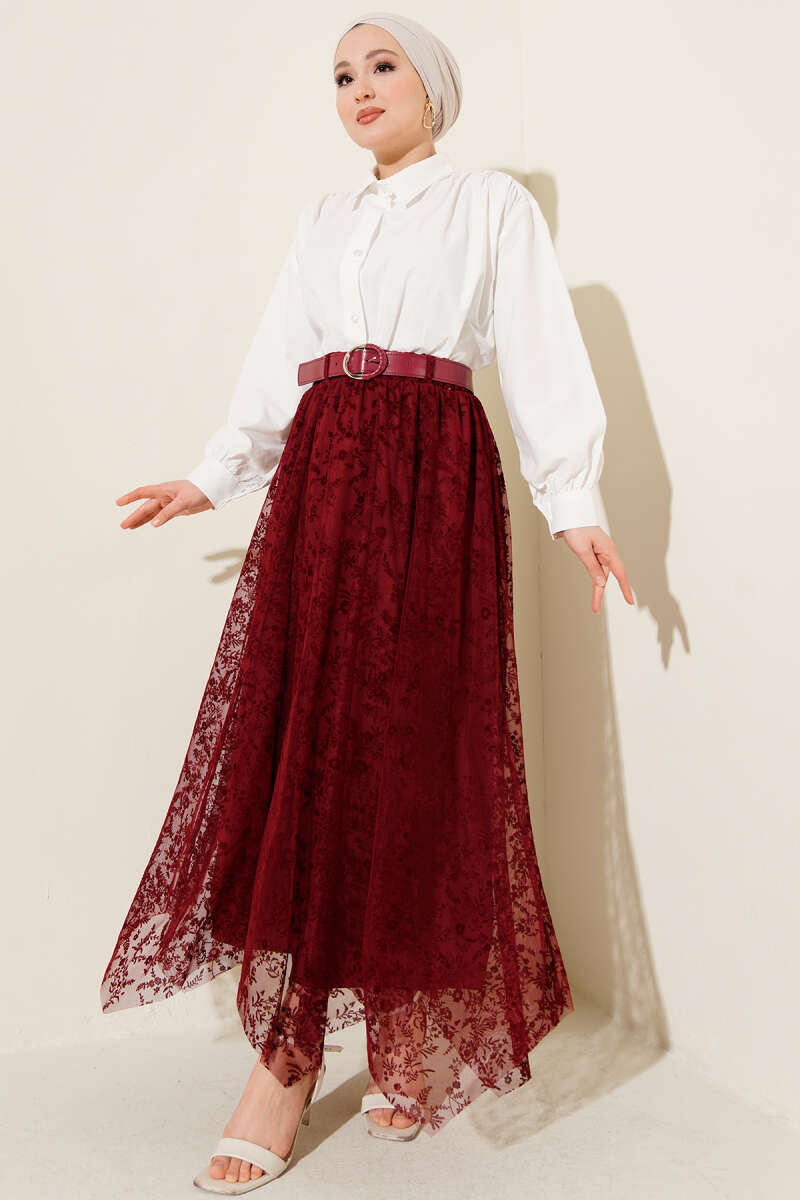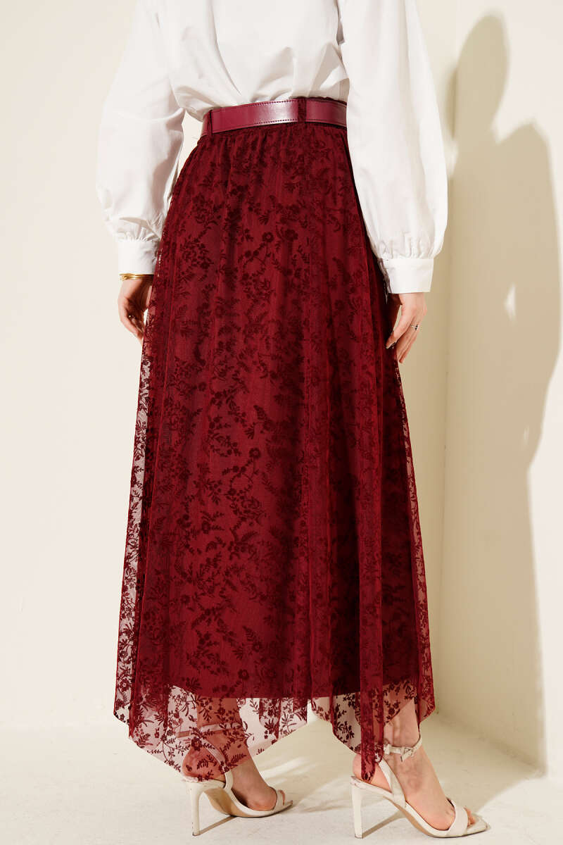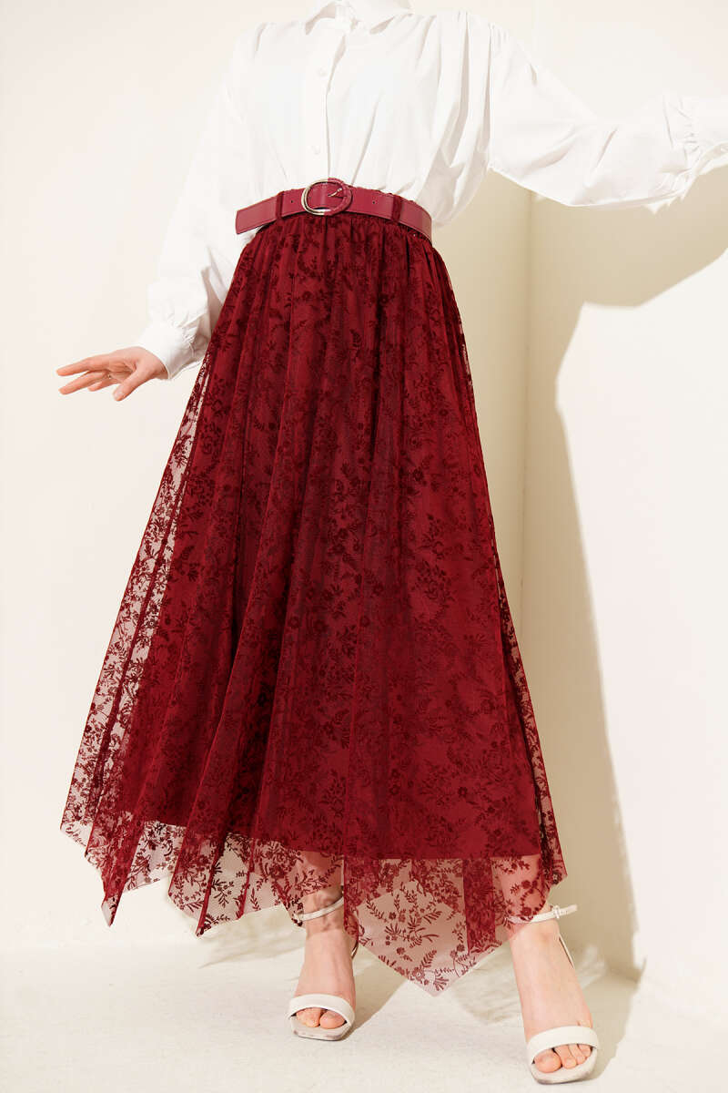 Etek Ucu Güpürlü Düğme Detaylı Etek Bordo