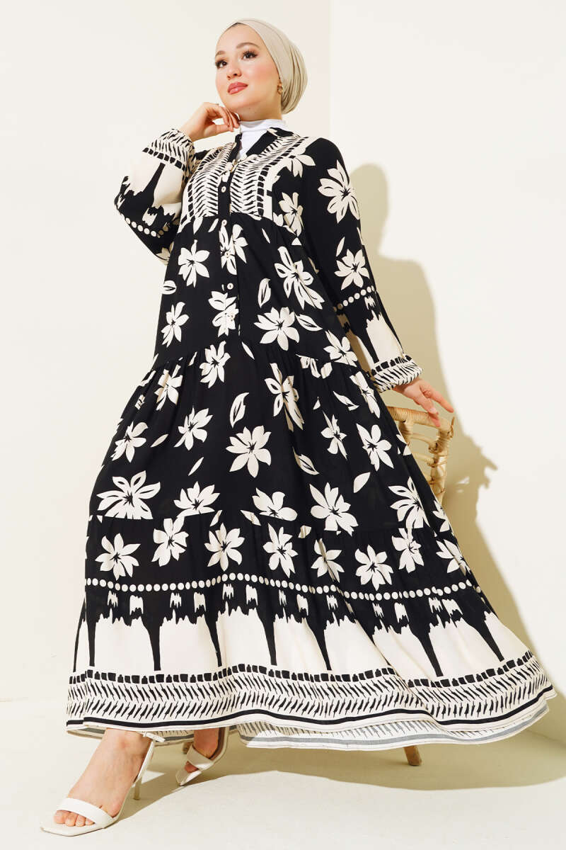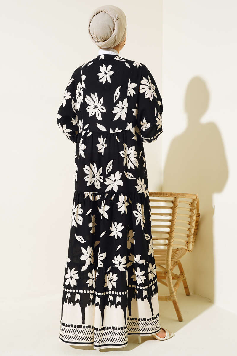 Çiçek Desen Yarı Patlı Elbise Siyah