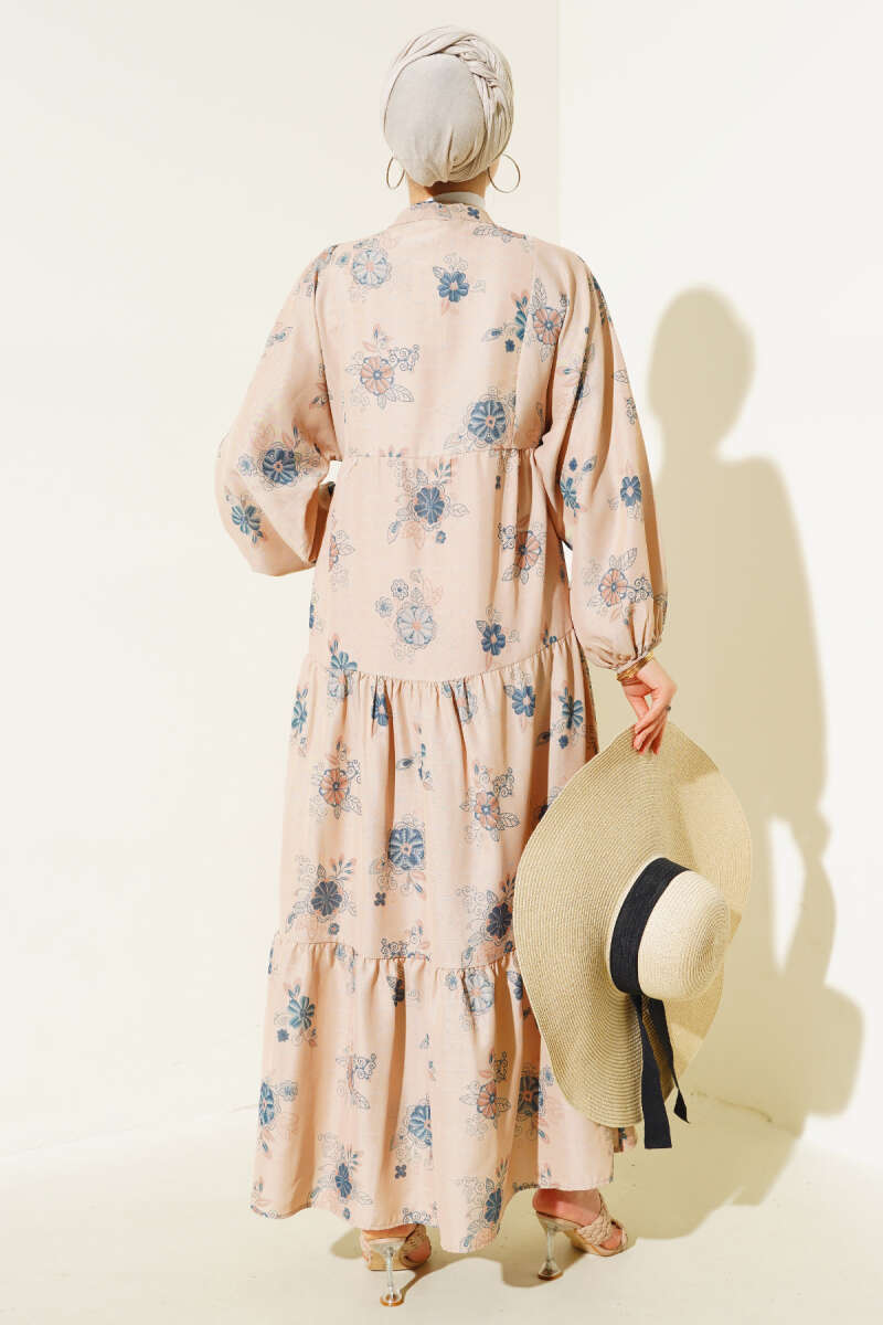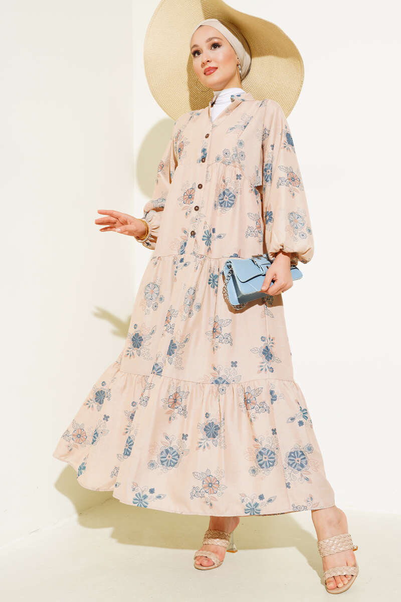 Çiçek Desen Yarım Düğmeli Kat Elbise İndigo