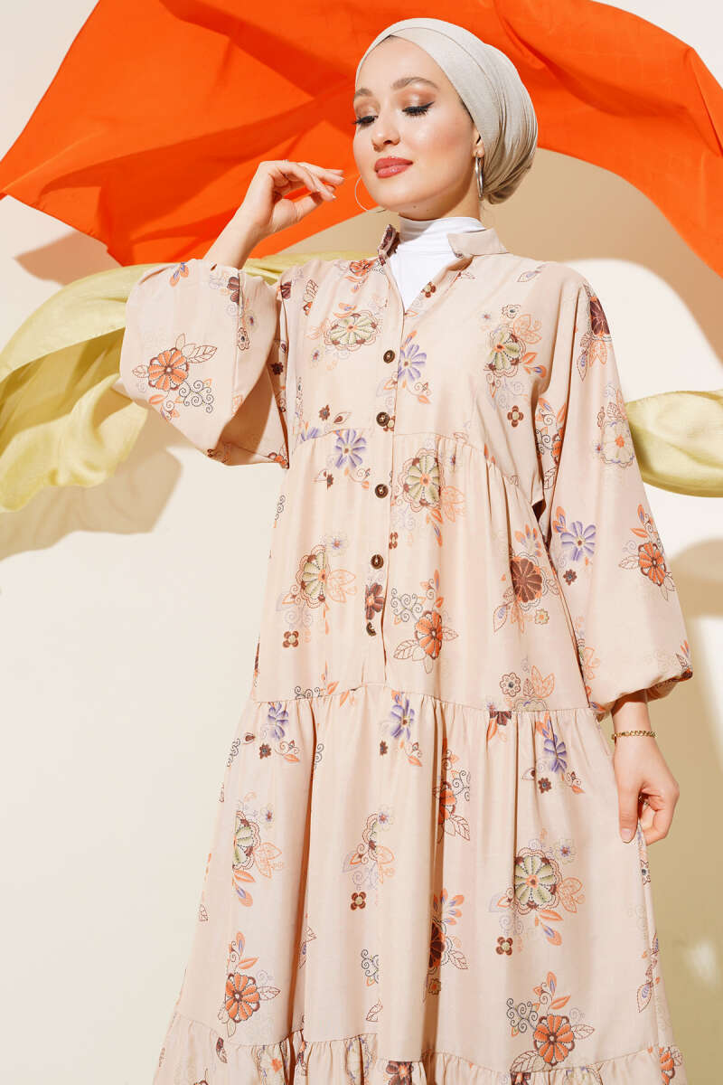 Kolları Fiyonk Detaylı Selanik Elbise Kahve