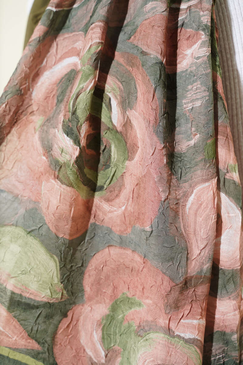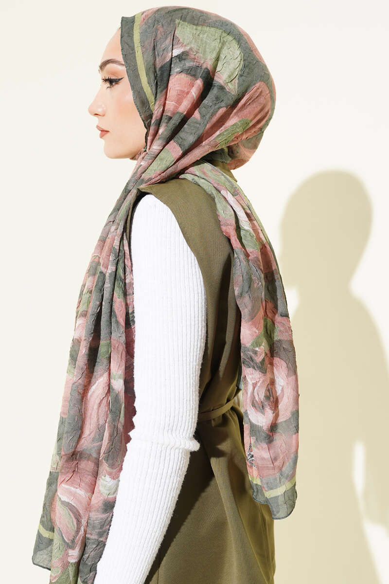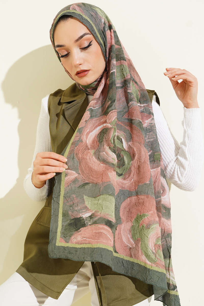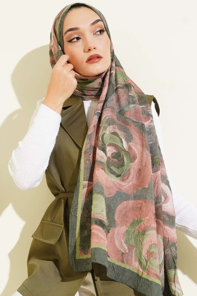 Çiçek Desenli Bambu Kraş Şal Yağ Yeşili