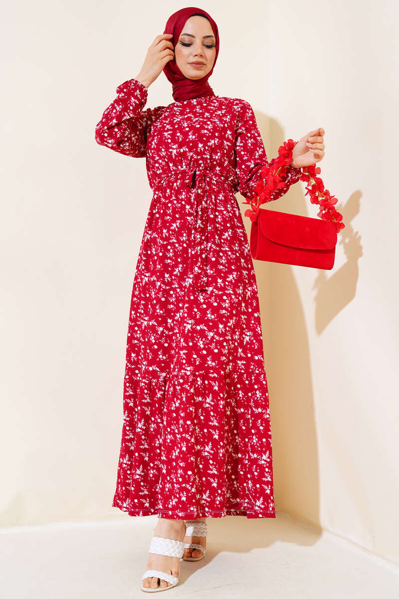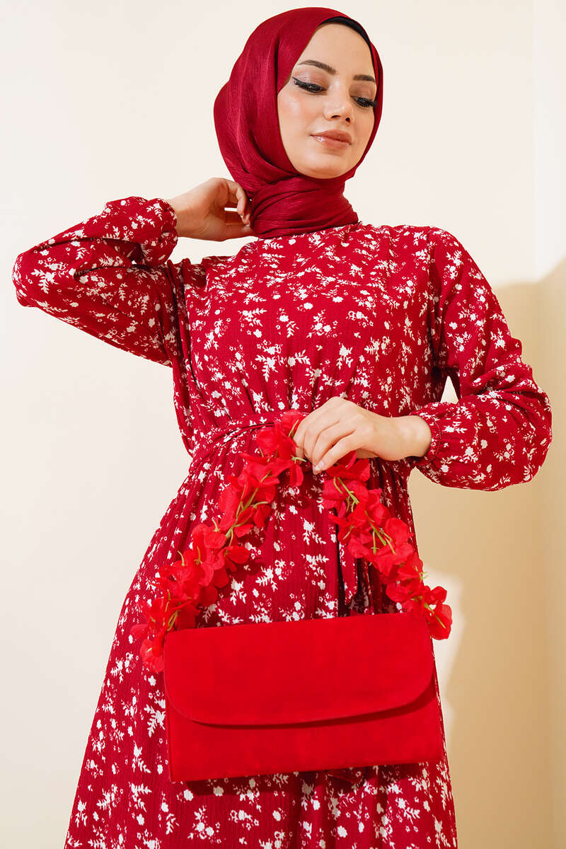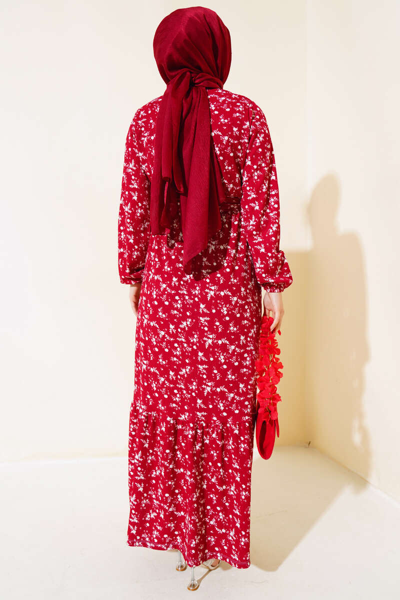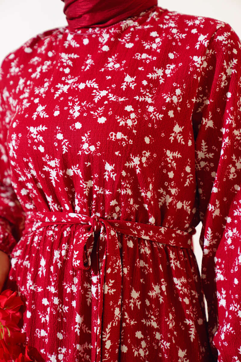 Çiçek Desenli Bel Lastikli Bürümcük Elbise Bordo