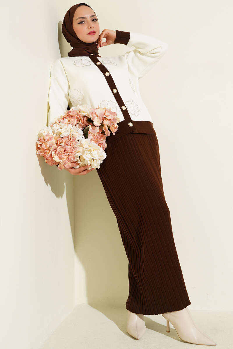 Çiçek Desenli Etekli Triko İkili Takım Saks