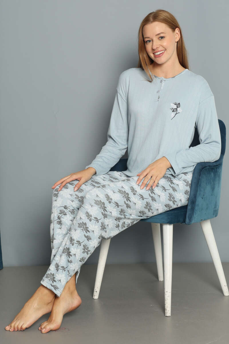 Çiçek Desenli Fitilli Pijama Takımı Bebe Mavi