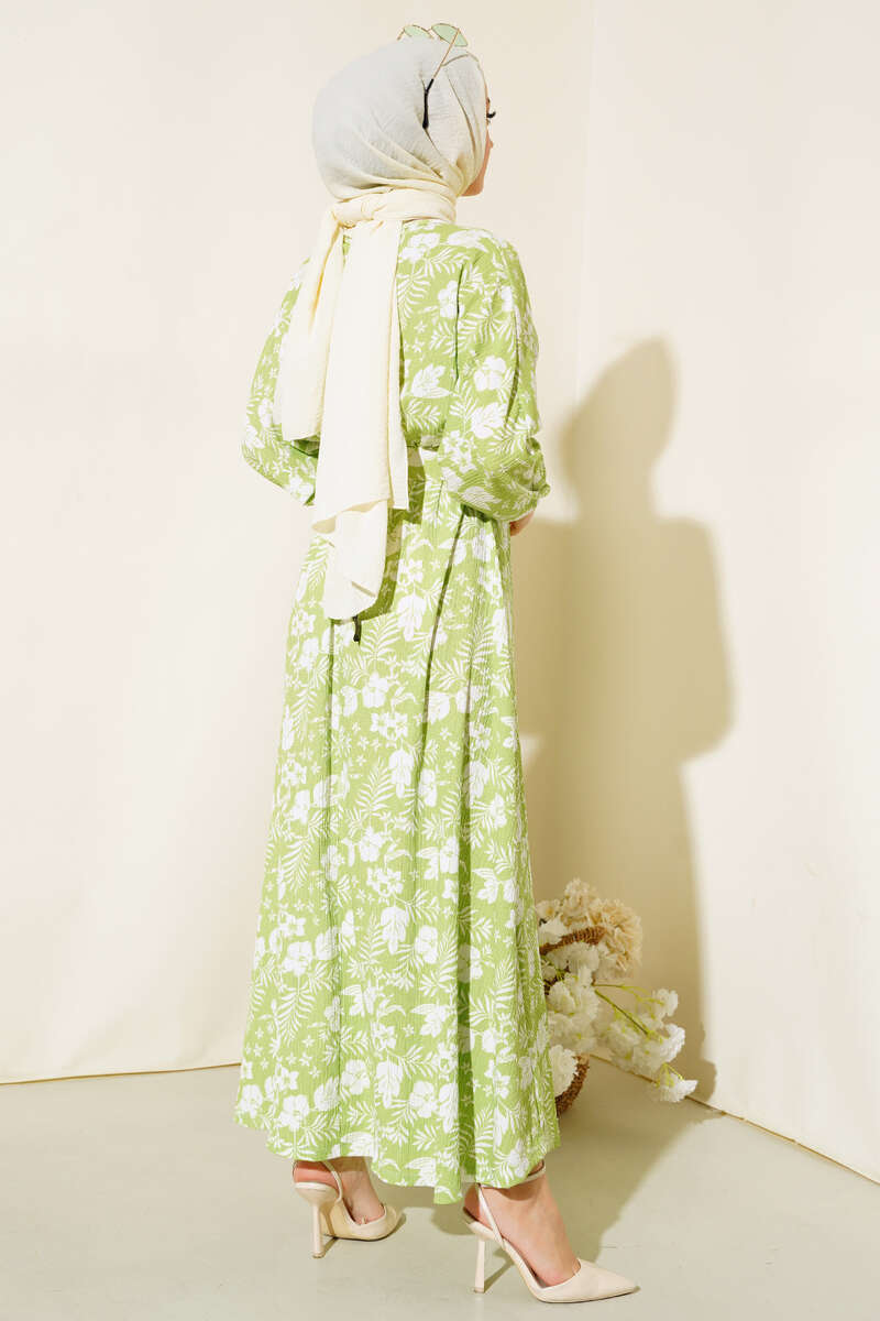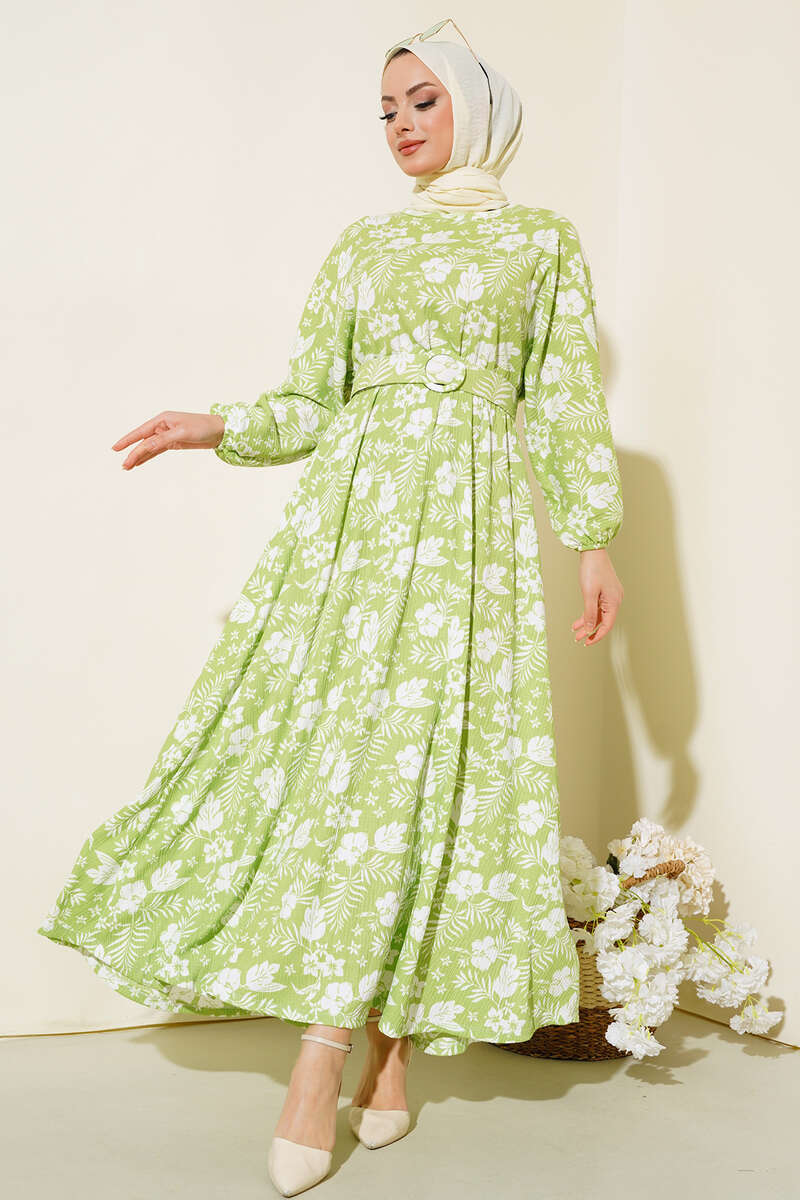 Çiçek Desenli Kemerli Elbise Çağla Yeşili