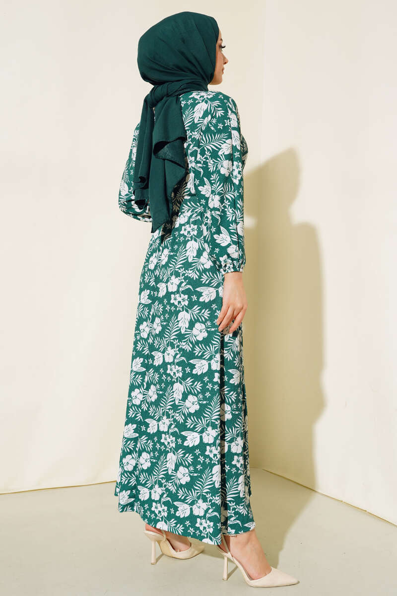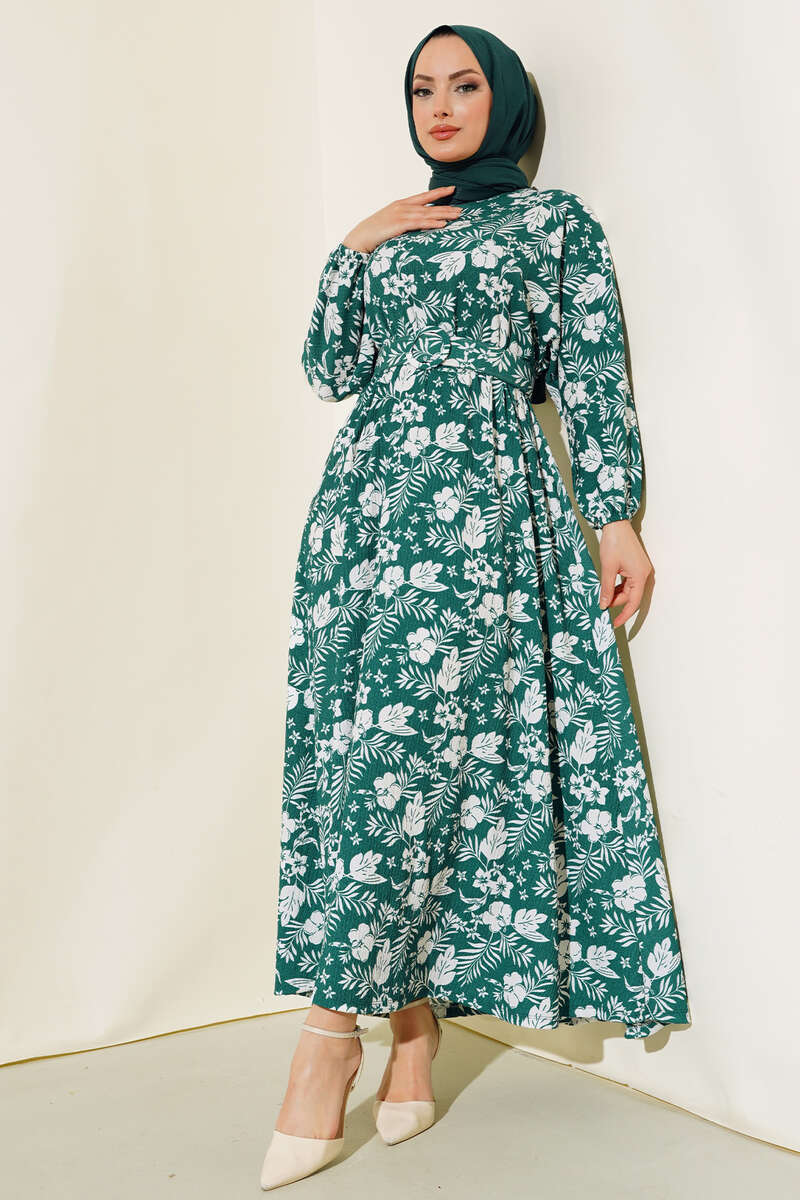 Çiçek Desenli Kemerli Elbise Zümrüt