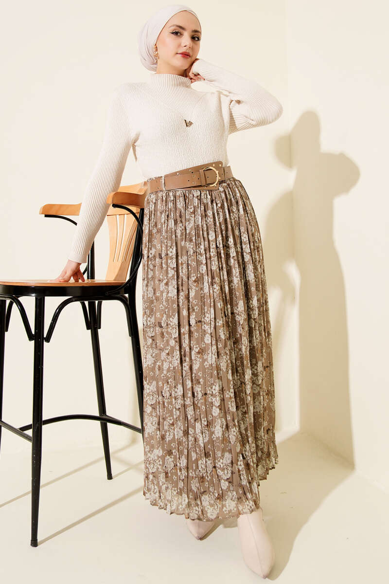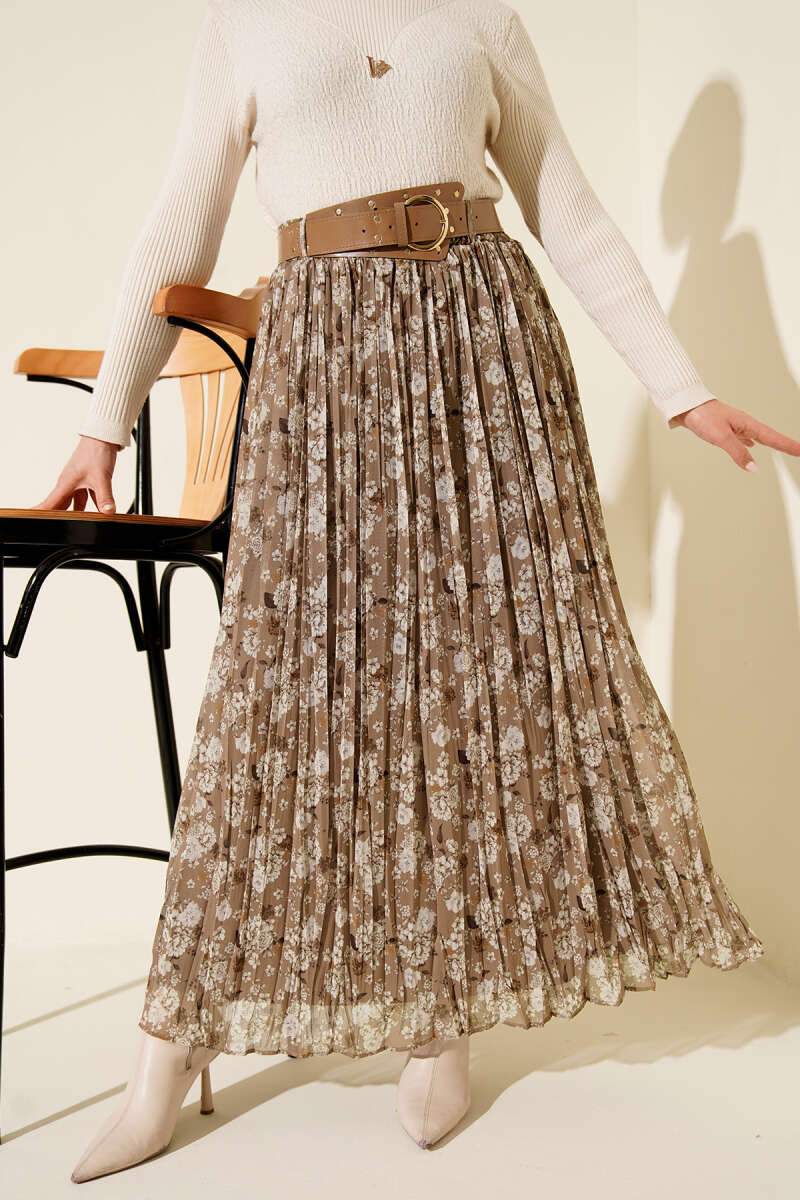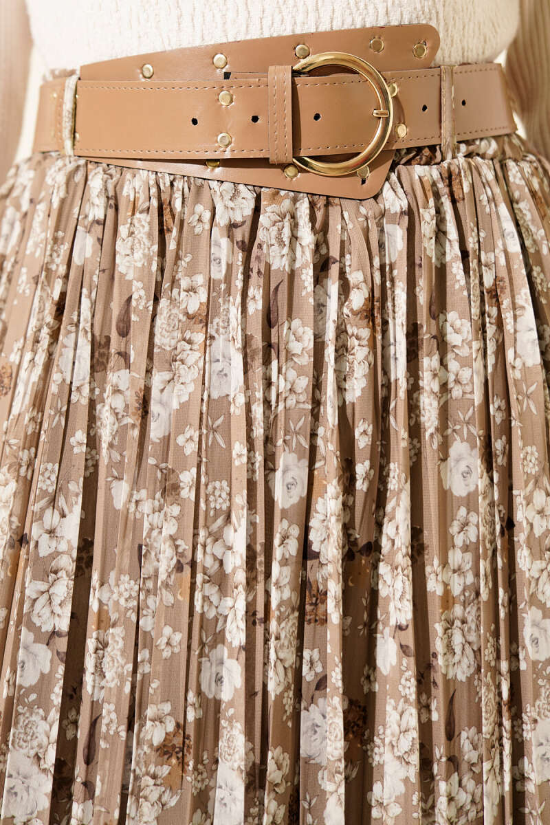 Çiçek Desenli Kemerli Piliseli Etek Latte