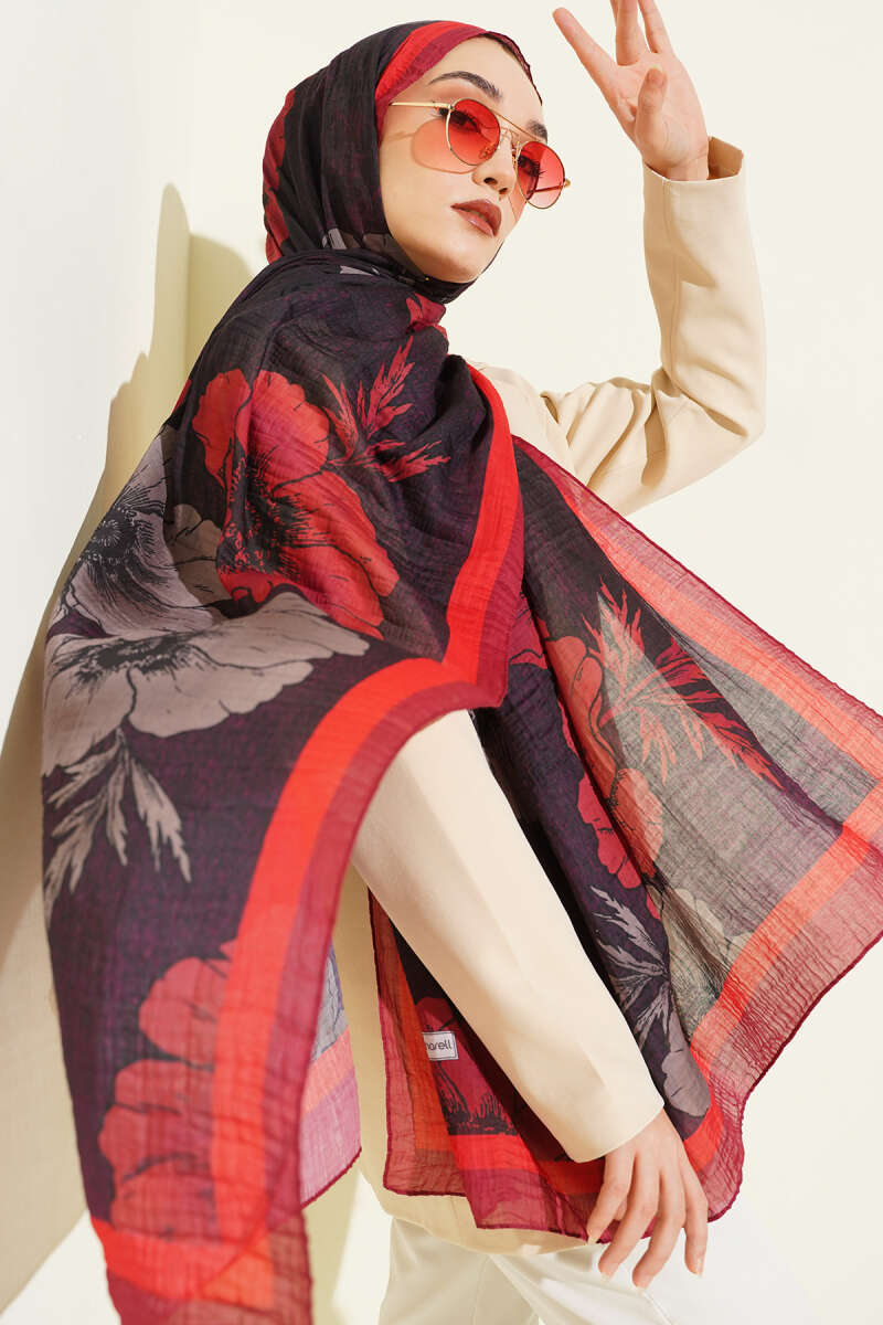 Çiçek Desenli Müslin Şal Füme