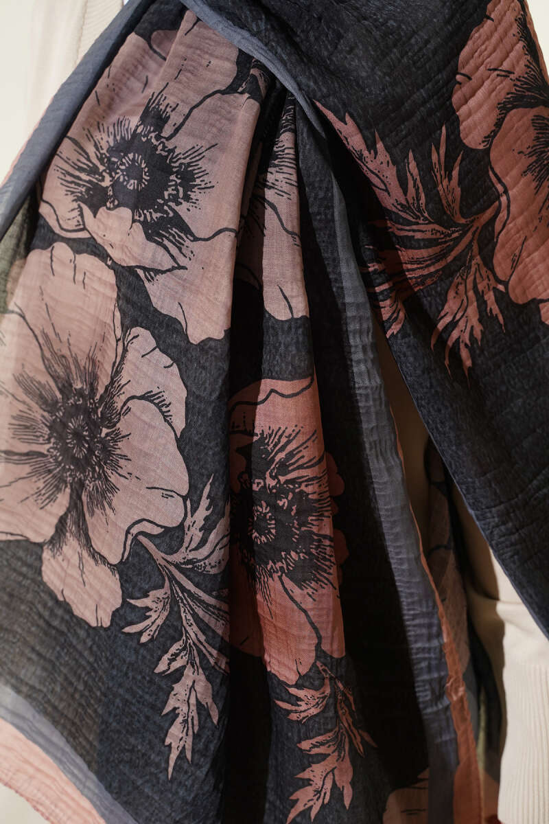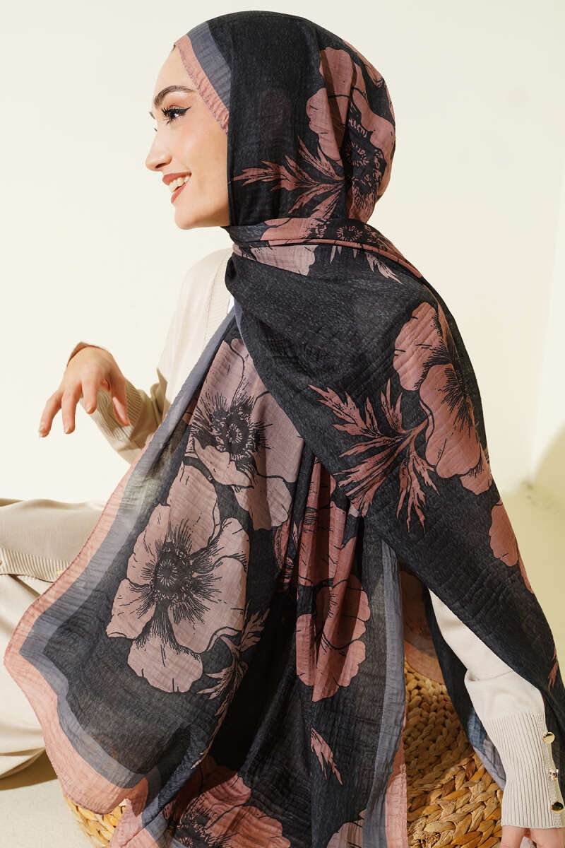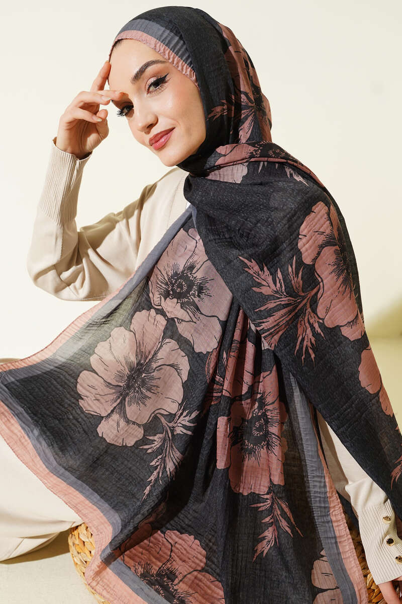 Çiçek Desenli Müslin Şal Siyah Latte