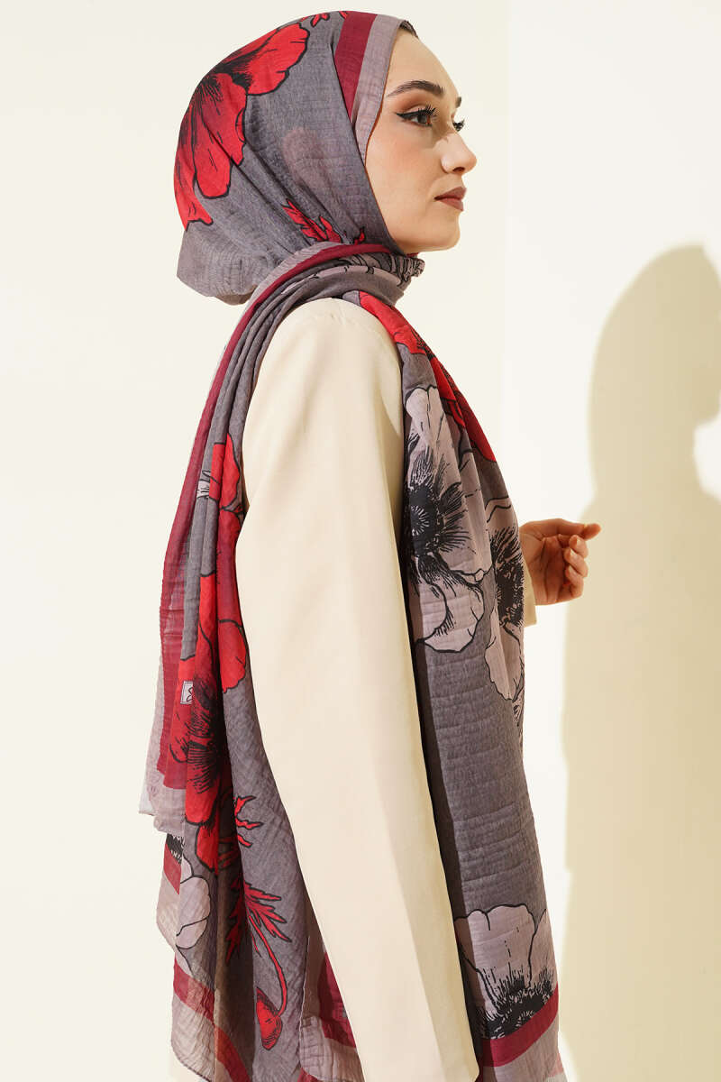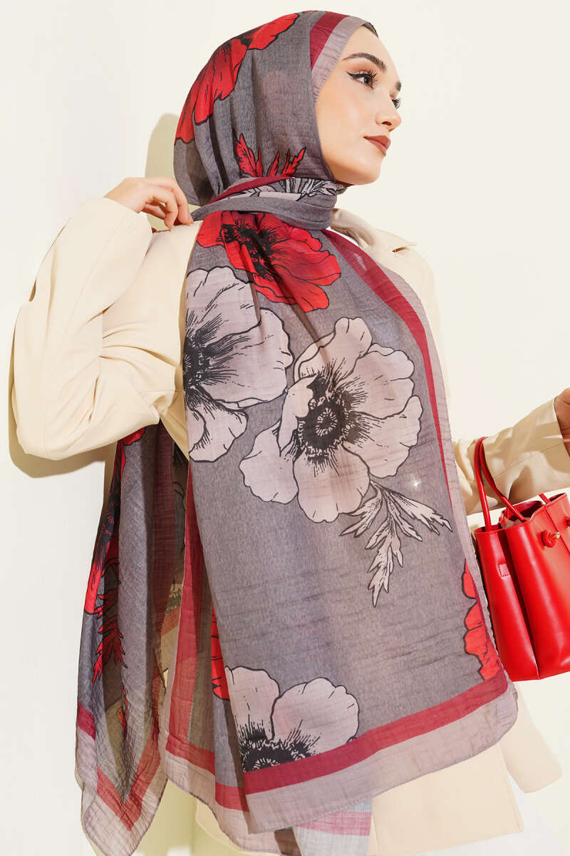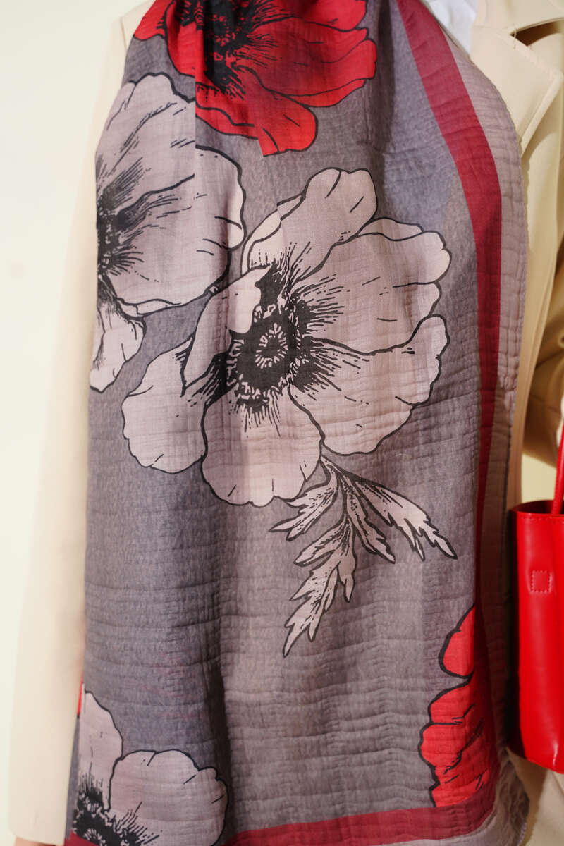Çiçek Desenli Müslin Şal Vizon