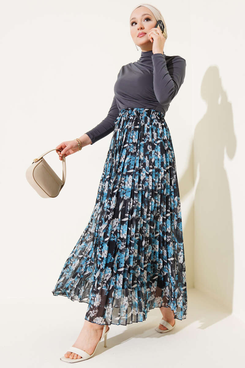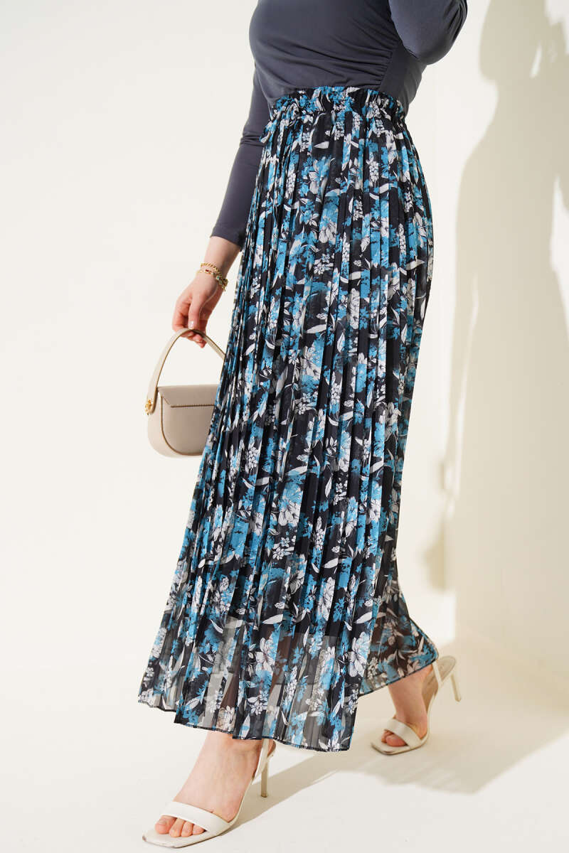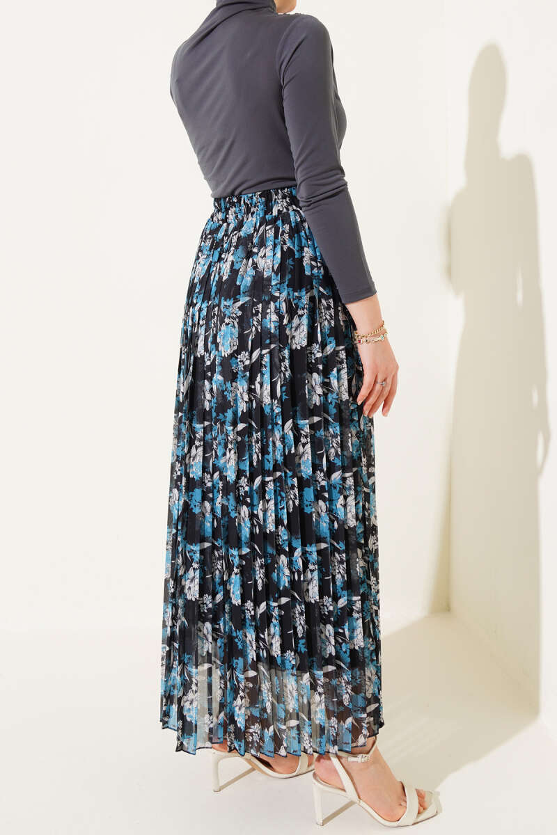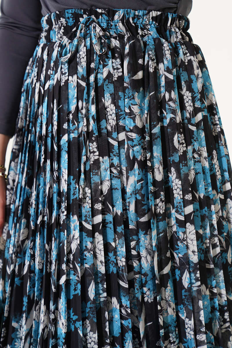 Çiçek Desenli Pileli Şifon Etek İndigo