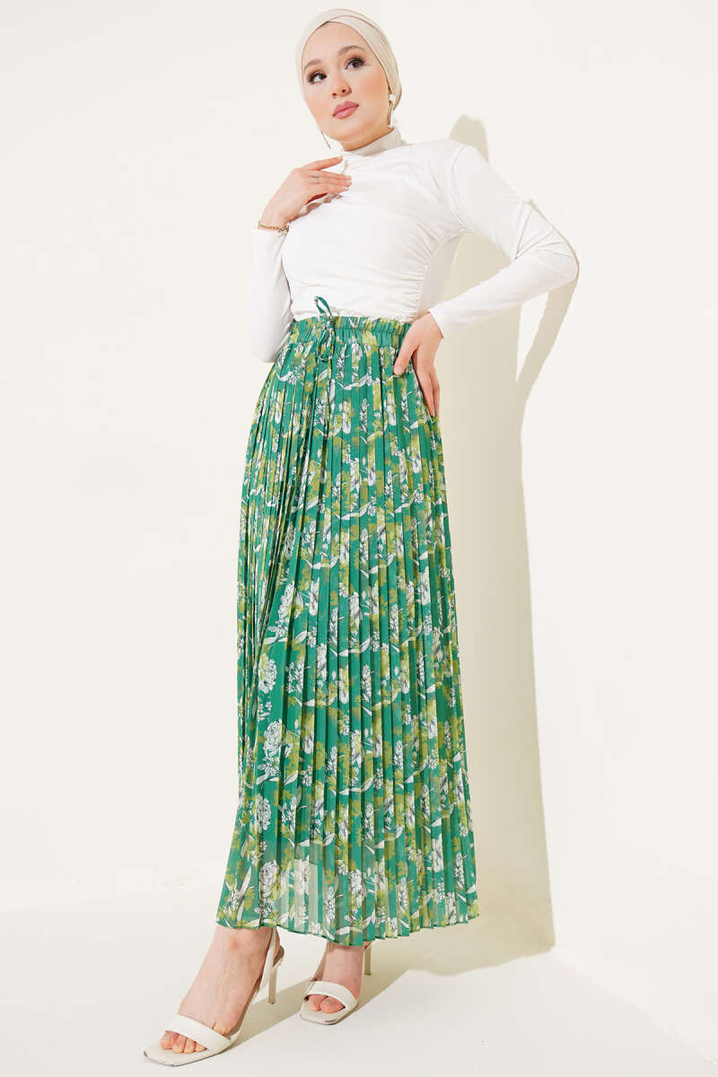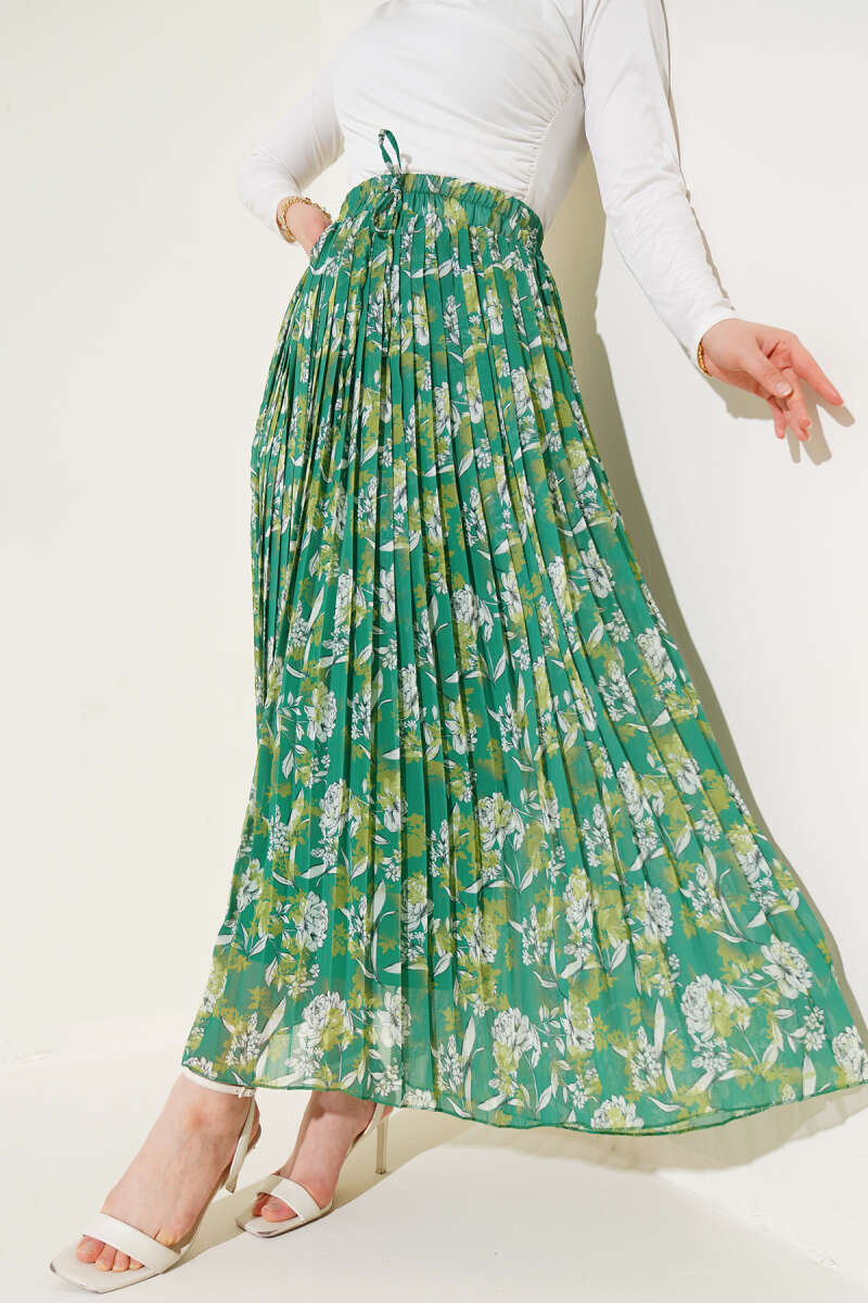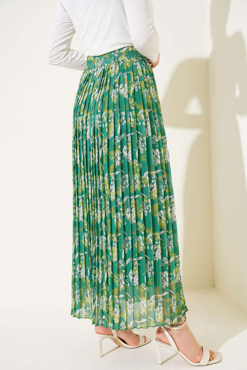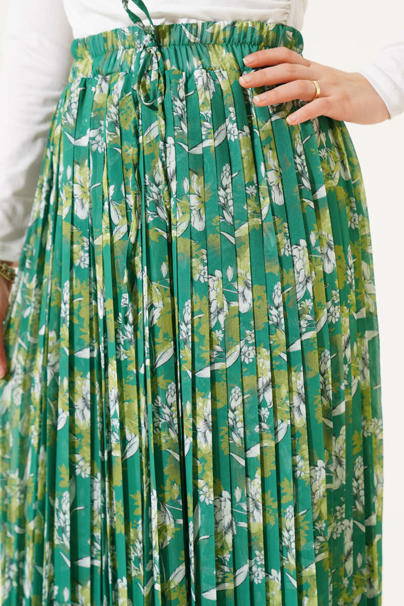 Çiçek Desenli Pileli Şifon Etek Yeşil