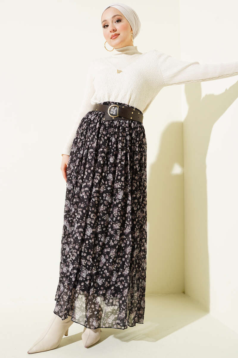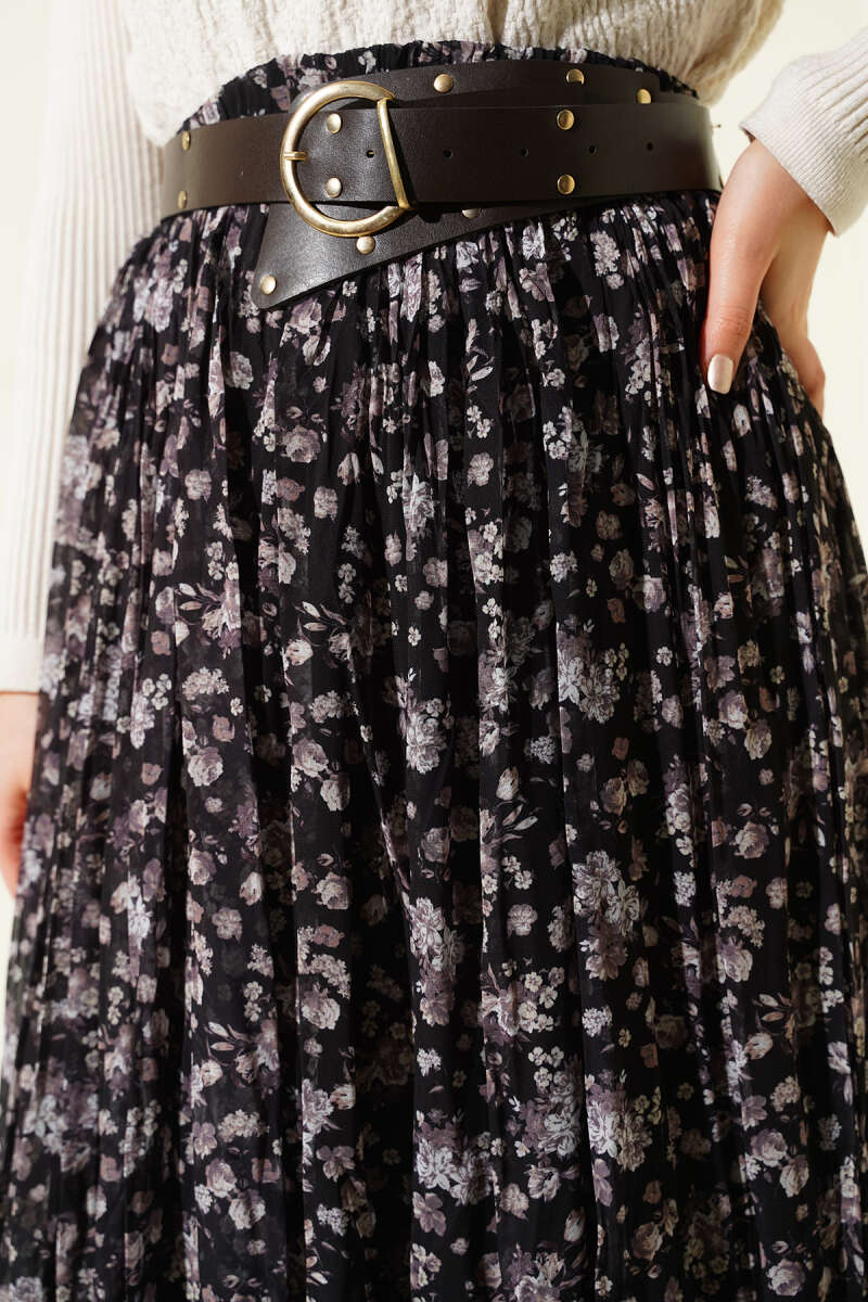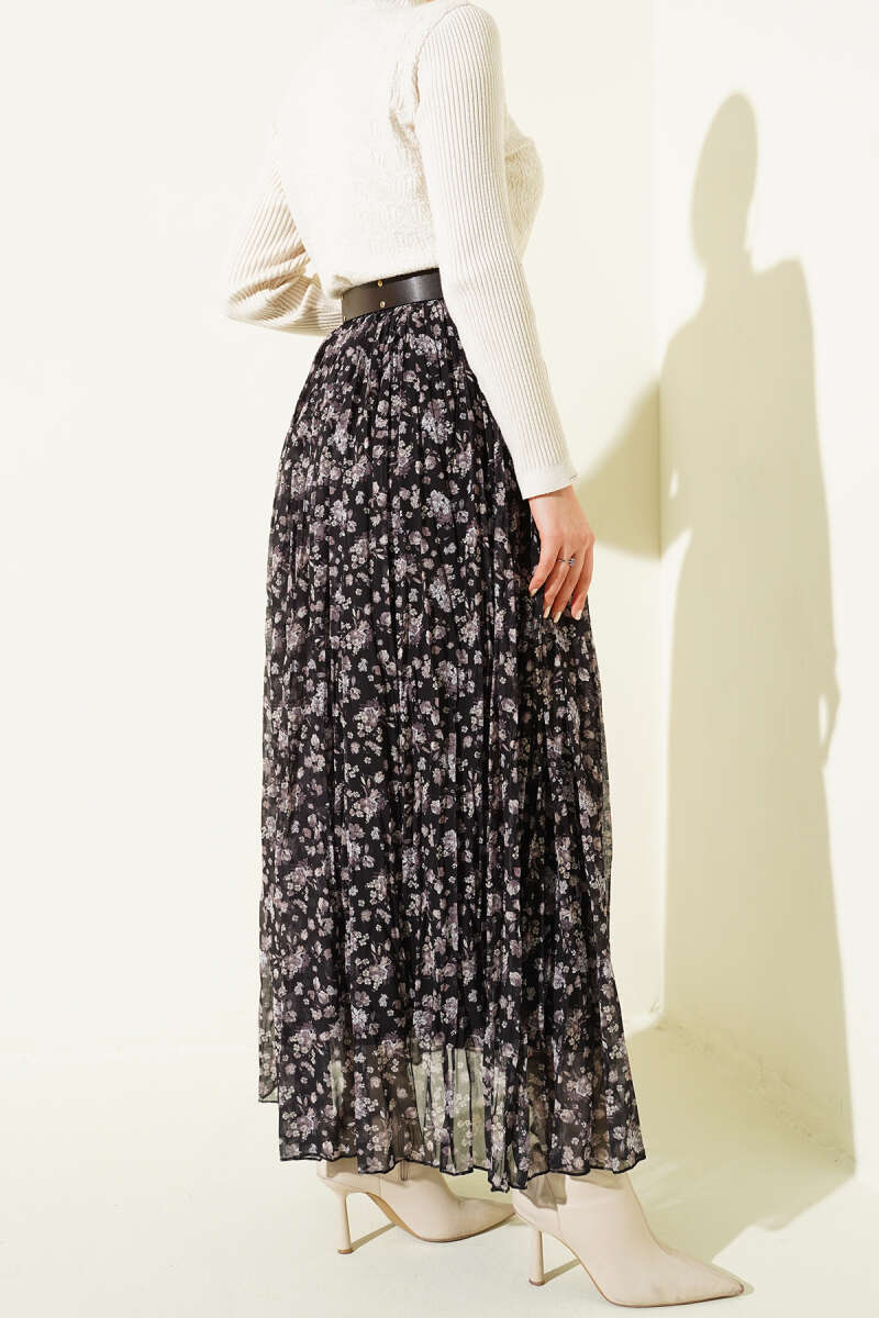 Çiçek Desenli Piliseli Şifon Etek Siyah